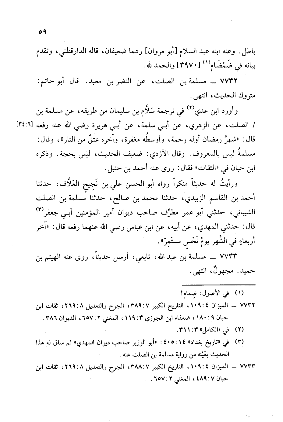 ورأيت له حديثا منكرا رواه أبو الحسن علي بن نجيح العلاف حدثنا أحمد بن القاسم الزبيدي حدثنا محمد بن صالح حَدَّثَنا مسلمة بن الصلت الشيباني حدثني أبو عمر مطرف صاحب ديوان أمير المؤمنين أبي جعفر قال: حدثني المهدي، عَن أبيه، عَن ابن عباس رضي الله عنهما رفعه قال: آخر أربعاء في الشهر يوم نحس مستمر.