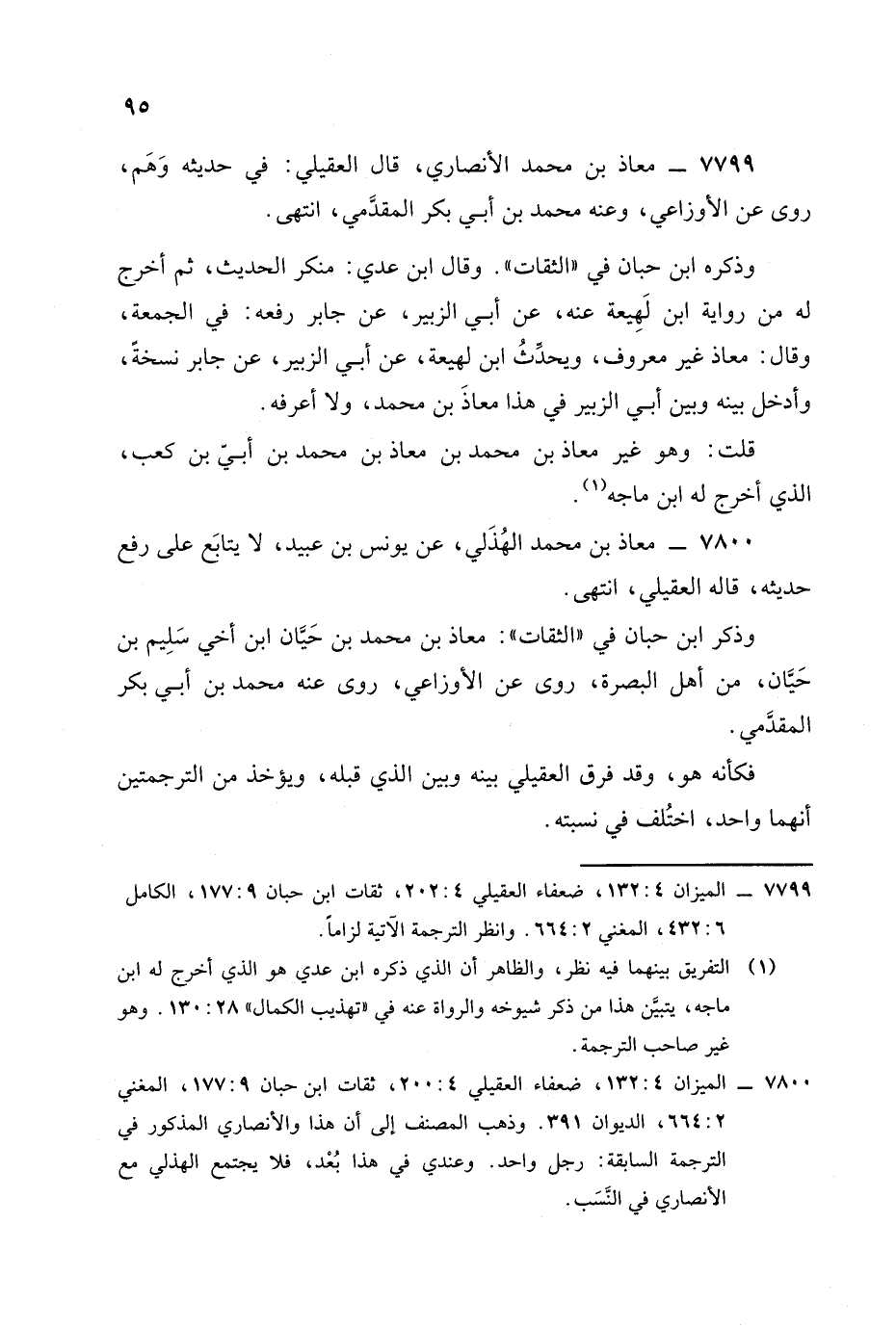 وقال ابن عَدِي: منكر الحديث , ثم أخرج له من رواية ابن لَهِيعَة عنه، عَن أبي الزبير، عَن جَابر رفعه: في الجمعة وقال: معاذ غير معروف ويحدث ابن لَهِيعَة، عَن أبي الزبير، عَن جَابر نسخة وأدخل بينه وبين أبي الزبير في هذا معاذ بن محمد، وَلا أعرفه.