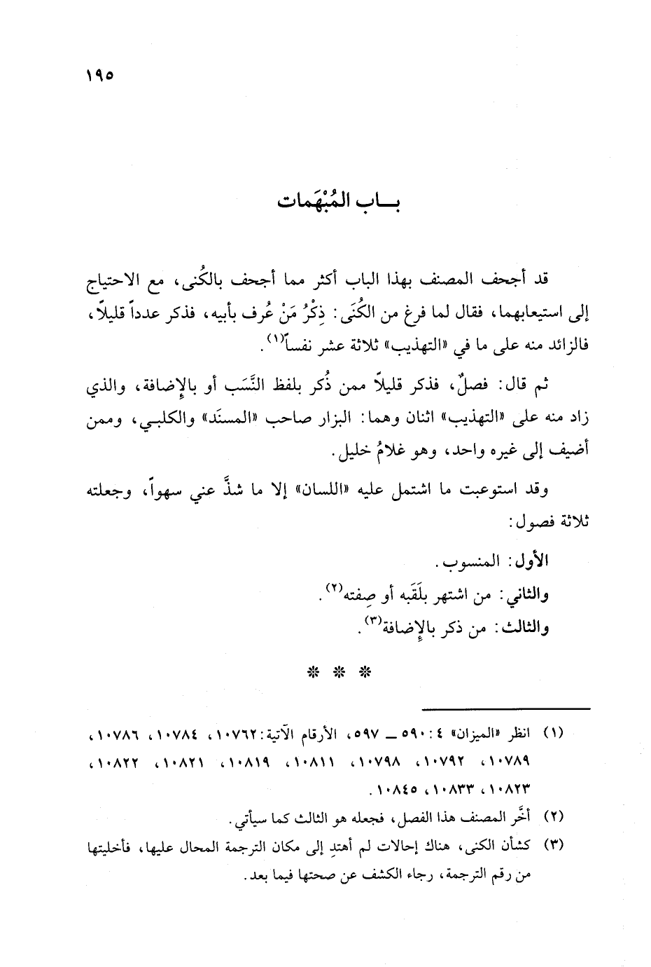 ثم قال: فصل , فذكر قليلا ممن ذكر بلفظ النسب أو بالإضافة والذي زاد منه على التهذيب اثنان وهما: البزار صاحب المسند والكلبي , وممن أضيف إلى غيره واحد وهو غلام خليل.
