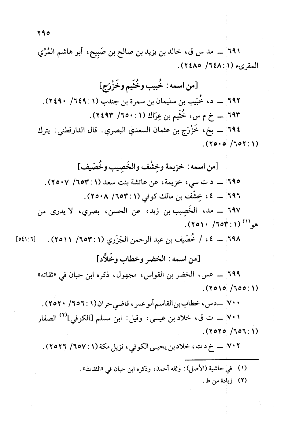 702 - خ د ت , خلاد بن يحيى الكوفي , نزيل مكة (1: 657/ 2526).