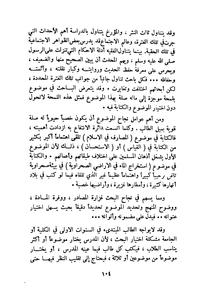 وقد يتناول ثالث النثر، والمؤرخ يتناول بالدراسة أهم الأحداث التي جرت في تلك الفترة، وعالم الاجتماع قد يدرس بعض الظواهر الاجتماعية في تلك الحقبة؛ بينما يتناول الفقيه أدلة الأحكام التي تنزلت على الرسول صلى الله عليه وسلم، ويهم المحدث أن يبين الصحيح منها والضعيف، ويحرص على معرفة حفظ الحديث وروايته وكبار نقلته وأئمته وحفاظه؛ فكل باحث تناول جانبًا من جوانب تلك الفترة المحددة؛ لكن أبحاثهم اختلفت وتغايرت. وقد يتعرض الباحث في موضوع بلمحة موجزة إلى ما له صلة بهذا الموضوع فمثل هذه اللمحة لا تحول دون اختيار الموضوع والكتابة فيه.