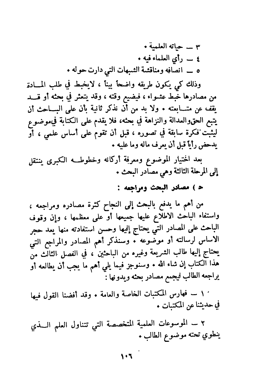 وذلك كي يكون طريقه واضحا بيِّنا، لا يخبط في طلب المادة من مصادرها خبط عشواء؛ فيضيع وقته. وقد يتعثر في بحثه أو قد يقف عن متابعته. ولا بد من أن نُذكِّر ثانية بأن على الباحث أن يتَّبع الحق والعدالة والنزاهة في بحثه؛ فلا يقدم على الكتابة في موضوع ليثبت فكرة سابقة في تصوره قبل أن تقوم على أساس علمي، أو يدحض رأيًا قبل أن يعرف ماله وما عليه.