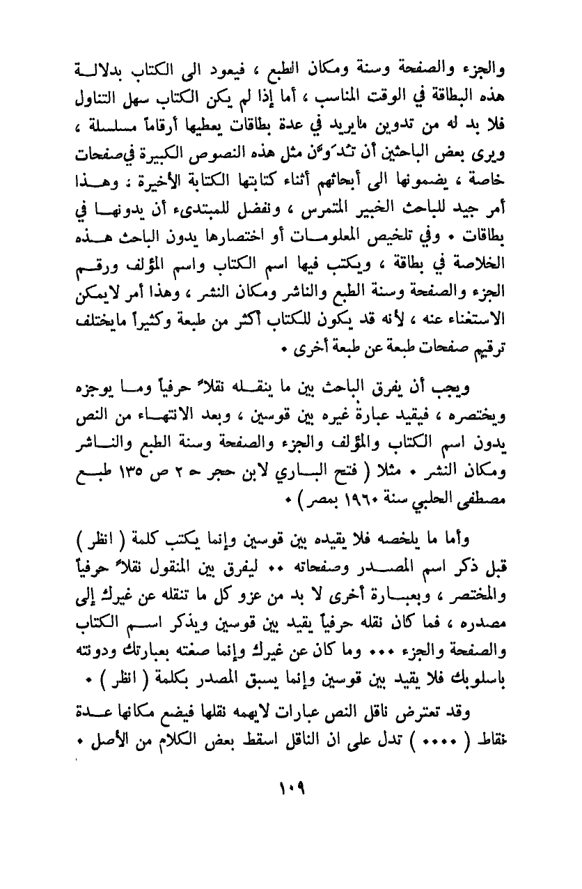 والجزء والصفحة وسنة ومكان الطبع؛ فيعود إلى الكتاب بدلالة هذه البطاقة في الوقت المناسب، أما إذا لم يكن الكتاب سهل التناول فلا بد له من تدوين ما يريد في عدة بطاقات يعطيها أرقامًا مسلسلة، ويرى بعض الباحثين أن تُدوَّن مثل هذه النصوص الكبيرة في صفحات خاصة، يضمونها إلى أبحاثهم أثناء كتابتها الكتابة الأخيرة، وهذا أمر جيد للباحث الخبير المتمرس، ونفضل للمبتدئ أن يُدوِّنها في بطاقات. وفي تلخيص المعلومات أو اختصارها يدون الباحث هذه الخلاصة في بطاقة، ويكتب فيها اسم الكتاب واسم المؤلف ورقم الجزء والصفحة وسنة الطبع والناشر ومكان النشر، وهذا الأمر لا يمكن الاستغناء عنه؛ لأنه قد يكون للكتاب أكثر من طبعة وكثيرًا ما يختلف ترقيم صفحات طبعة عن طبعة أخرى.