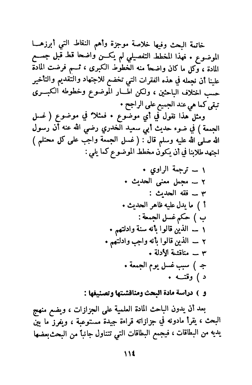 خاتمة البحث: وفيها خلاصة موجزة وأهم النقاط التي أبرزها الموضوع؛ فهذا المخطط التفصيلي لم يكن واضحًا قط قبل جمع المادة، وكل ما كان واضحًا منه الخطوط الكبرى، ثم فرضت المادة علينا أن نجعله في هذه الفقرات التي تخضع للاجتهاد والتقديم والتأخير حسب اختلاف الباحثين؛ ولكن إطار الموضوع وخطوطه الكبرى تبقى كما هي عند الجميع على الراجح.