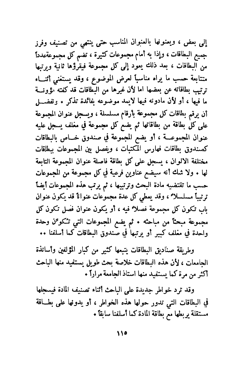 إلى بعض، ويعنونها بالعنوان المناسب حتى ينتهي من تصنيف وفرز جميع البطاقات، وإذا به أمام مجموعات كثيرة تضم كل مجموعة عددًا من البطاقات. بعد ذلك يعود إلى كل مجموعة فيقرؤها ثانية ويرتبها متتابعة حسب ما يراه مناسبًا لعرض الموضوع، وقد يستغني أثناء ترتيب بطاقاته عن بعضها؛ إما لأن غيرها من البطاقات قد كفته مؤونة ما فيها، أو لأن ما دونه فيها لا يمد موضوعه بفائدة تذكر. ونفضل أن يرقم بطاقات كل مجموعة بأرقام مسلسلة، ويسجل عنوان المجموعة على كل بطاقة من بطاقاتها ثم يضع كل مجموعة في مغلف يسجل عليه عنوان المجموعة، أو يضع المجموعة في صندوق خاص بالبطاقات كصندوق بطاقات فهارس المكتبات، ويفصل بين المجموعات ببطاقات مختلفة الألوان، يسجل على كل بطاقة فاصلة عنوان المجموعة التابعة لها. ولا شك أنه سيضع عناوين فرعية في كل مجموعة من المجموعات حسب ما تقتضيه مادة البحث وترتيبها، ثم يرتب هذه المجموعات أيضًا ترتيبًا مسلسلًا، وقد يعطي كل عدة مجموعات عنوانًا قد يكون عنوان باب تكون كل مجموعة فصلًا فيه، أو يكون عنوان فصل تكون كل مجموعة مبحثًا من مباحثه. ثم يضع المجموعات التي تكون وحدة واحدة في مغلف كبير أو يرتبها في صندوق البطاقات كما أسلفنا..