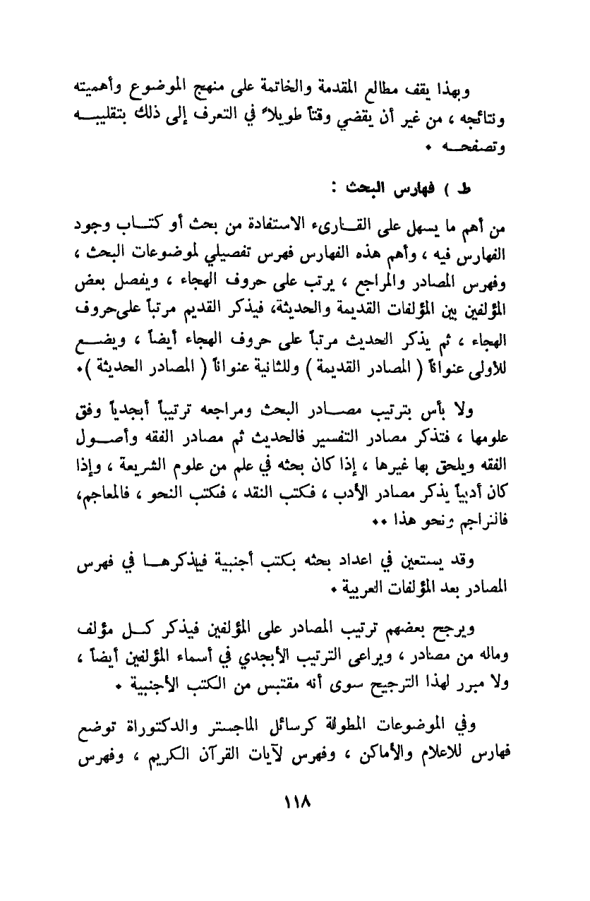من أهم ما يسهل على القارئ الاستفادة من بحث أو كتاب وجود الفهارس فيه، وأهم هذه الفهارس فهرس تفصيلي لموضوعات البحث، وفهرس المصادر والمراجع، يرتب على حروف الهجاء، ويفصل بعض المؤلفين بين المؤلفات القديمة والحديثة؛ فيذكر القديم مُرتّبًا على حروف الهجاء، ثم يذكر الحديث مُرتّبًا على حروف الهجاء أيضًا، ويضع للأولى عنوانًا "المصادر القديمة" وللثانية عنوانًا "المصادر الحديثة".