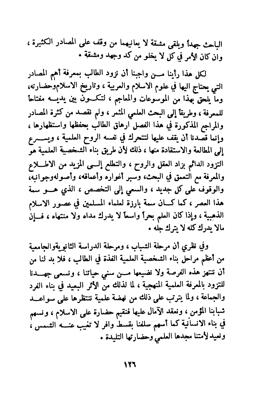 لكل هذا رأينا من واجبنا أن نزود الطالب بمعرفة أهم المصادر التي يحتاج إليها في علوم الإسلام والعربية، وتاريخ الإسلام وحضارته، وما يلحق بهذا من الموسوعات والمعاجم؛ لتكون بين يديه مفتاحا للمعرفة، وطريقًا إلى البحث العلمي المثمر، ولم نقصد من كثرة المصادر والمراجع المذكورة في هذا الفصل إرهاق الطالب بحفظها واستظهارها؛ وإنما قصدنا أن يقف عليها لتتحرك في نفسه الروح العلمية، ويسرع إلى المطالعة والاستفادة منها؛ ذلك لأن طريق بناء الشخصية العلمية هو التزود الدائم بزاد العقل والروح، والتطلع إلى المزيد من الاطلاع والمعرفة مع التعمق في البحث، وسَبْرِ أَغْوَارِهِ وأعماقه، وأصوله وجوانبه، والوقوف على كل جديد، والسعي إلى التخصص، الذي هو سمة هذا العصر، كما كان سمة بارزة لعلماء المسلمين في عصور الإسلام الذهبية، وإذا كان العلم بحرًا واسعًا لا يدرك مداه ولا منتهاه؛ فإن ما لا يدرك كله لا يترك جله.