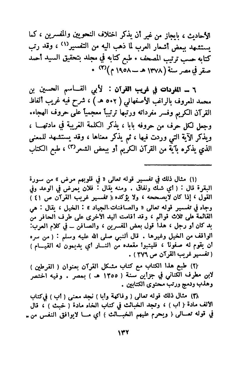 لأبي القاسم الحسين بن محمد المعروف بالراغب الأصفهاني "502هـ"، شرح فيه غريب ألفاظ القرآن الكريم وفسر مفرداته ورتبها ترتيبًا معجميًّا على حروف الهجاء. وجعل لكل حرف من حروفه بابًا، يذكر الكلمة الغريبة في مادتها، ويذكر الآية التي وردت فيها، ثم يذكر معناها، وقد يستشهد للمعنى الذي يذكره بآية من القرآن الكريم أو ببعض الشعر1، طبع الكتاب في مجلد كبير بتحقيق الأستاذ محمد سيد كيلاني في مصر سنة "1381هـ - 1961م" وطبع قبل ذلك.