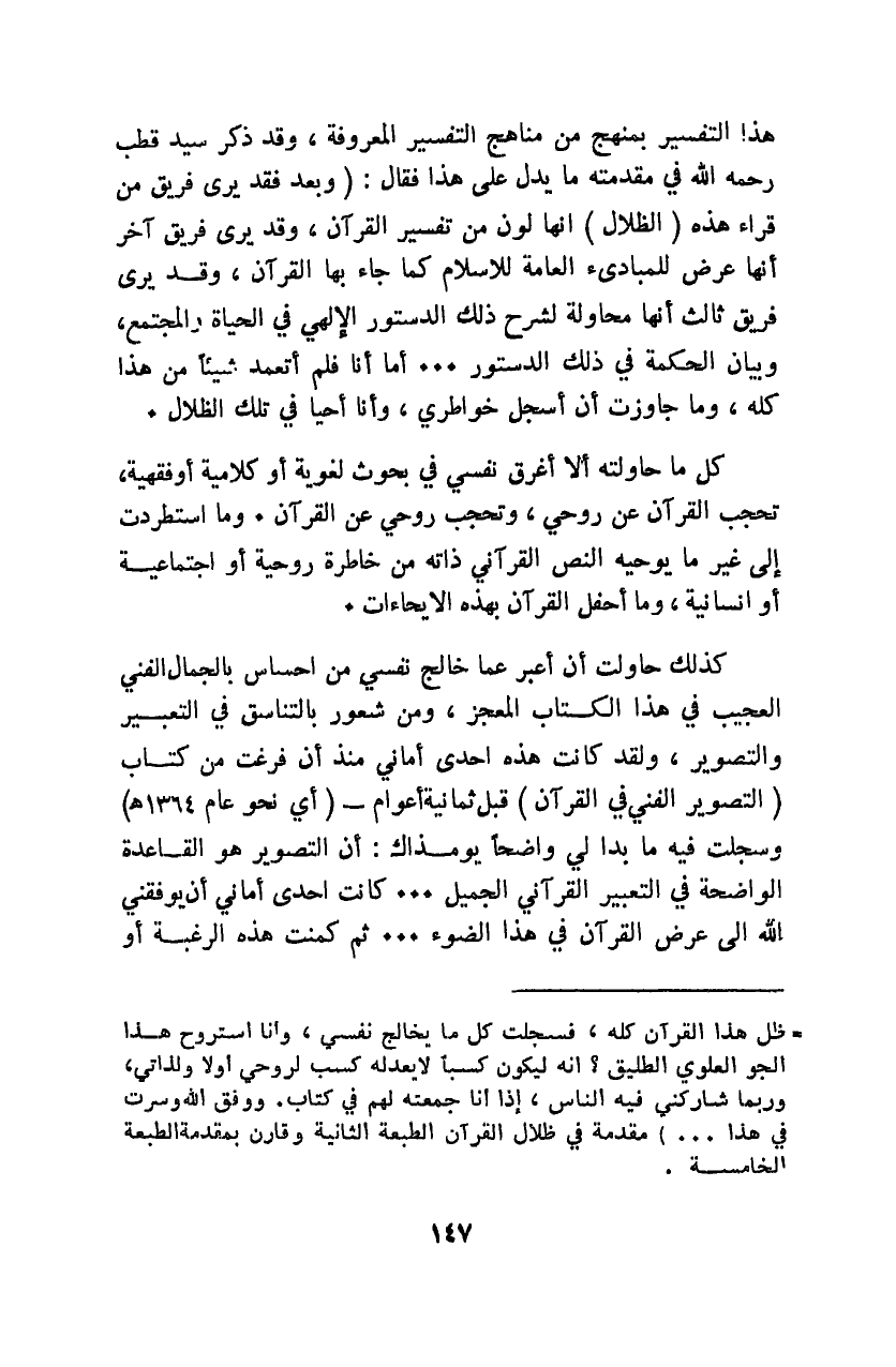 كذلك حاولت أن أُعَبِّر عما خالج نفسي من إحساس بالجمال الفني العجيب في هذا الكتاب المعجز، ومن شعور بالتناسق في التعبير والتصوير، ولقد كانت هذه إحدى أماني منذ أن فرغت من كتاب "التصوير الفني في القرآن" قبل ثمانية أعوام -"أي نحو عام 1364هـ"- وسجلت فيه ما بدا لي واضحًا يومذاك: أن التصوير هو القاعدة الواضحة في التعبير القرآني الجميل. كانت إحدى أماني أن يوفقني الله إلى عرض القرآن في هذا الضوء. ثم كمنت هذه الرغبة أو