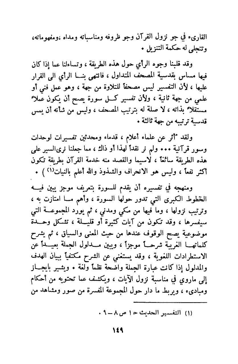 وقد قلبنا وجوه الرأي حول هذه الطريقة، وتساءلنا عَمَّا إذا كان فيها مساس بقدسية المصحف المتداول؛ فانتهى بنا الرأي إلى القرار عليها؛ لأن التفسير ليس مصحفًا للتلاوة من جهة، وهو عمل فني أو علمي من جهة ثانية، ولأن تفسير كل سورة يصح أن يكون عملًا مستقلًا بذاته، لا صلة له بترتيب المصحف، وليس من شأنه أن يَمَسَّ قدسية ترتيبه من جهة ثالثة.