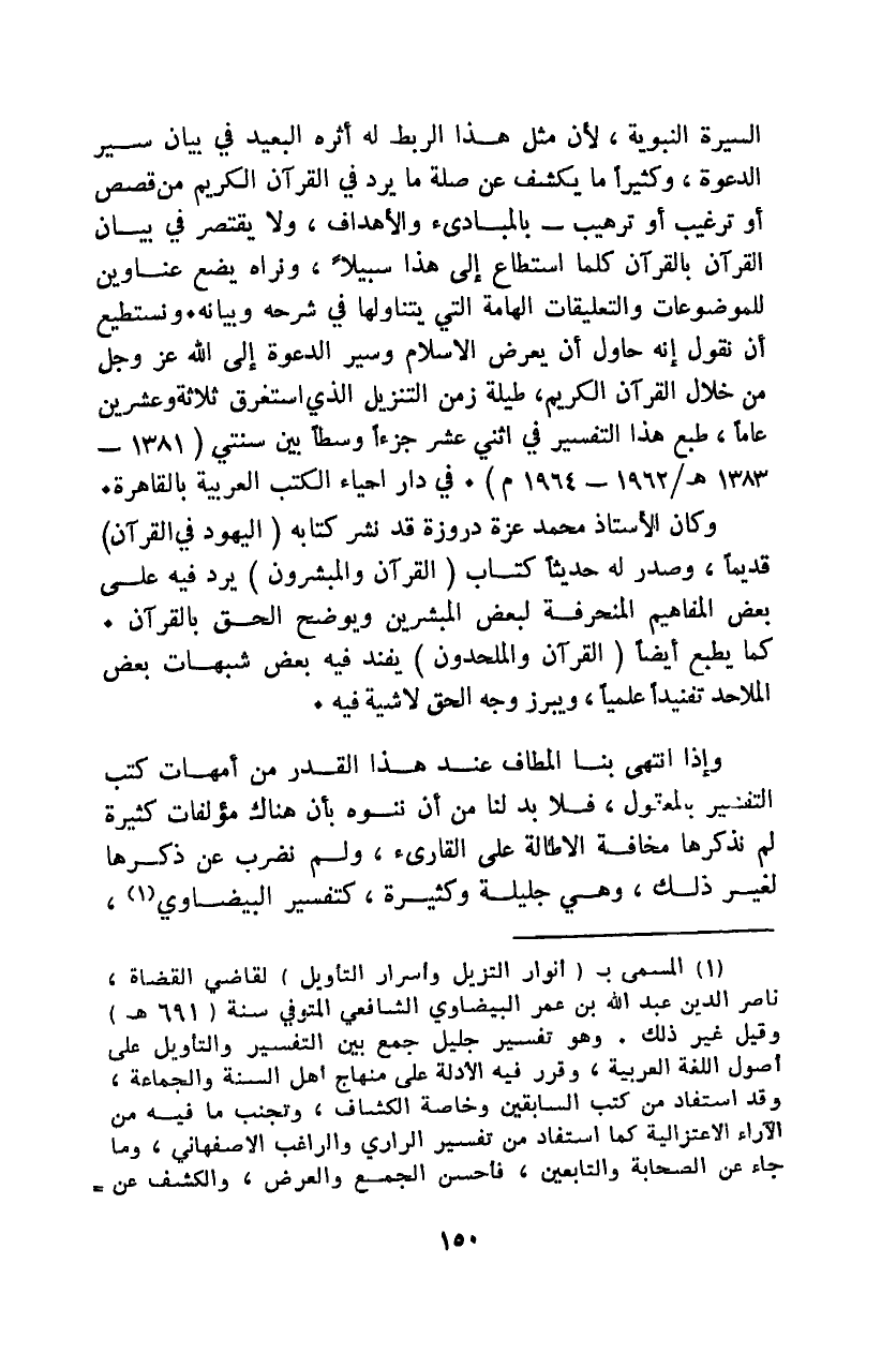 السيرة النبوية؛ لأن مثل هذا الربط له أثره البعيد في بيان سير الدعوة، وكثيرًا ما يكشف عن صلة ما يرد في القرآن الكريم -من قصص أو ترغيب أو ترهيب- بالمبادئ والأهداف، ولا يقتصر في بيان القرآن بالقرآن كلما استطاع إلى هذا سبيلًا، ونراه يضع عناوين للموضوعات والتعليقات الهامة التي يتناولها في شرحه وبيانه. ونستطيع أن نقول: إنه حاول أن يعرض الإسلام وسير الدعوة إلى الله عز وجل من خلال القرآن الكريم، طيلة زمن التنزيل الذي استغرق ثلاثة وعشرين عامًا، طبع هذا التفسير في اثني عشر جزءًا وسطًا بين سنتي "1381 - 1383هـ / 1962 - 1964م". في دار إحياء الكتب العربية بالقاهرة.