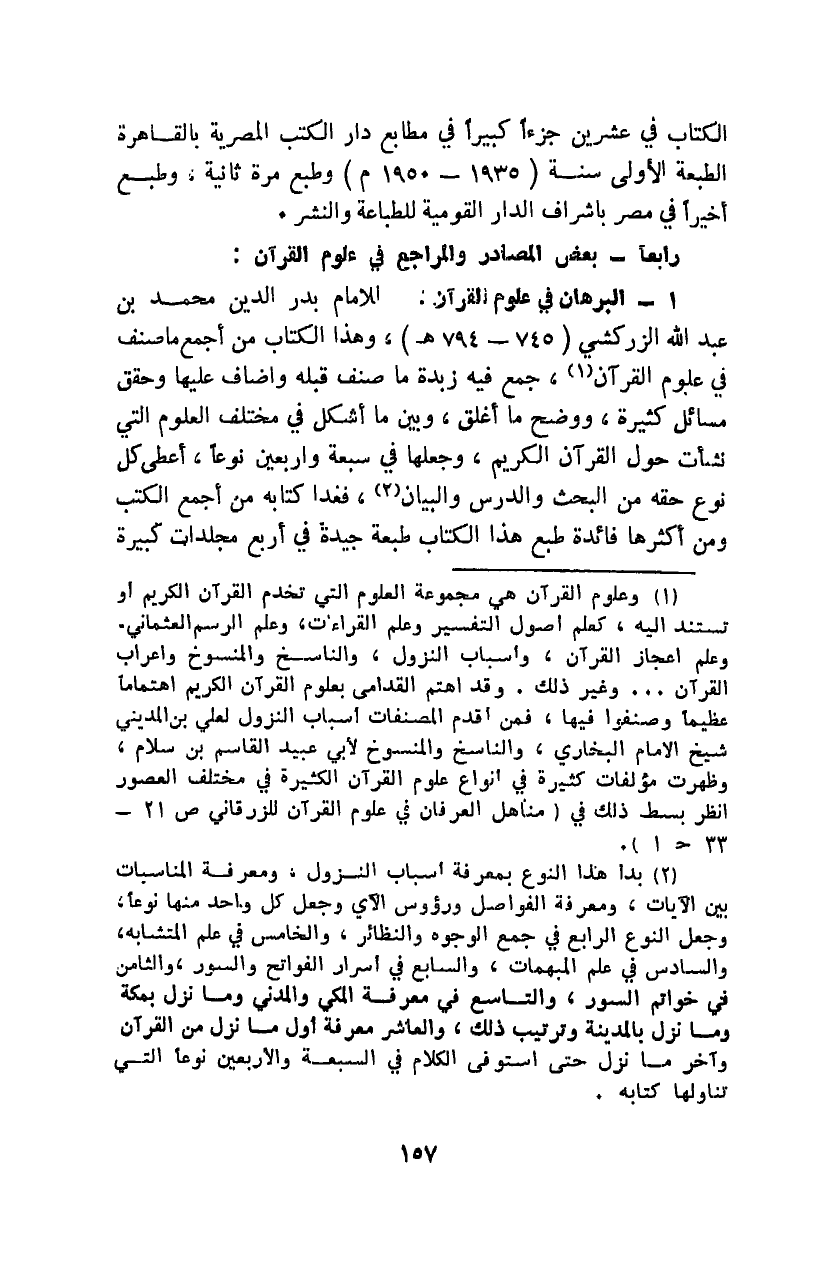 للإمام بدر الدين محمد بن عبد الله الزركشي "745 - 794هـ"، وهذا الكتاب من أجمع ما صنف في علوم القرآن1، جمع فيه زبدة ما صنف قبله وأضاف عليها وحقق مسائل كثيرة، ووضح ما أغلق، وبين ما أشكل في مختلف العلوم التي نشأت حول القرآن الكريم، وجعلها في سبعة وأربعين نوعًا، أعطى كل نوع حقه من البحث والدرس والبيان2، فَغَدَا كتابه من أجمع الكتب ومن أكثرها فائدة طبع هذا الكتاب طبعة جيدة في أربع مجلدات كبيرة بتحقيق الأستاذ محمد أبو الفضل إبراهيم سنة "1376هـ - 1957م" بمصر.
