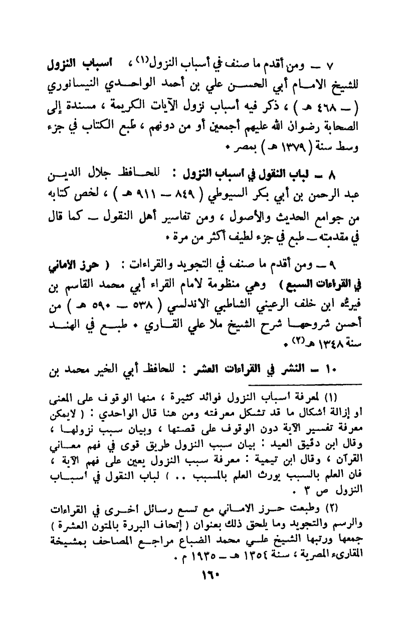 ومن أقدم ما صنف في أسباب النزول1، أسباب النزول للشيخ الإمام أبي الحسن على بن أحمد الواحدي النيسابوري "- 468هـ"، ذكر فيه أسباب نزول الآيات الكريمة، مسندة إلى الصحابة رضوان الله عليهم أجمعين أو من دونهم، طبع الكتاب في جزء وسط سنة "1379هـ" بمصر.
