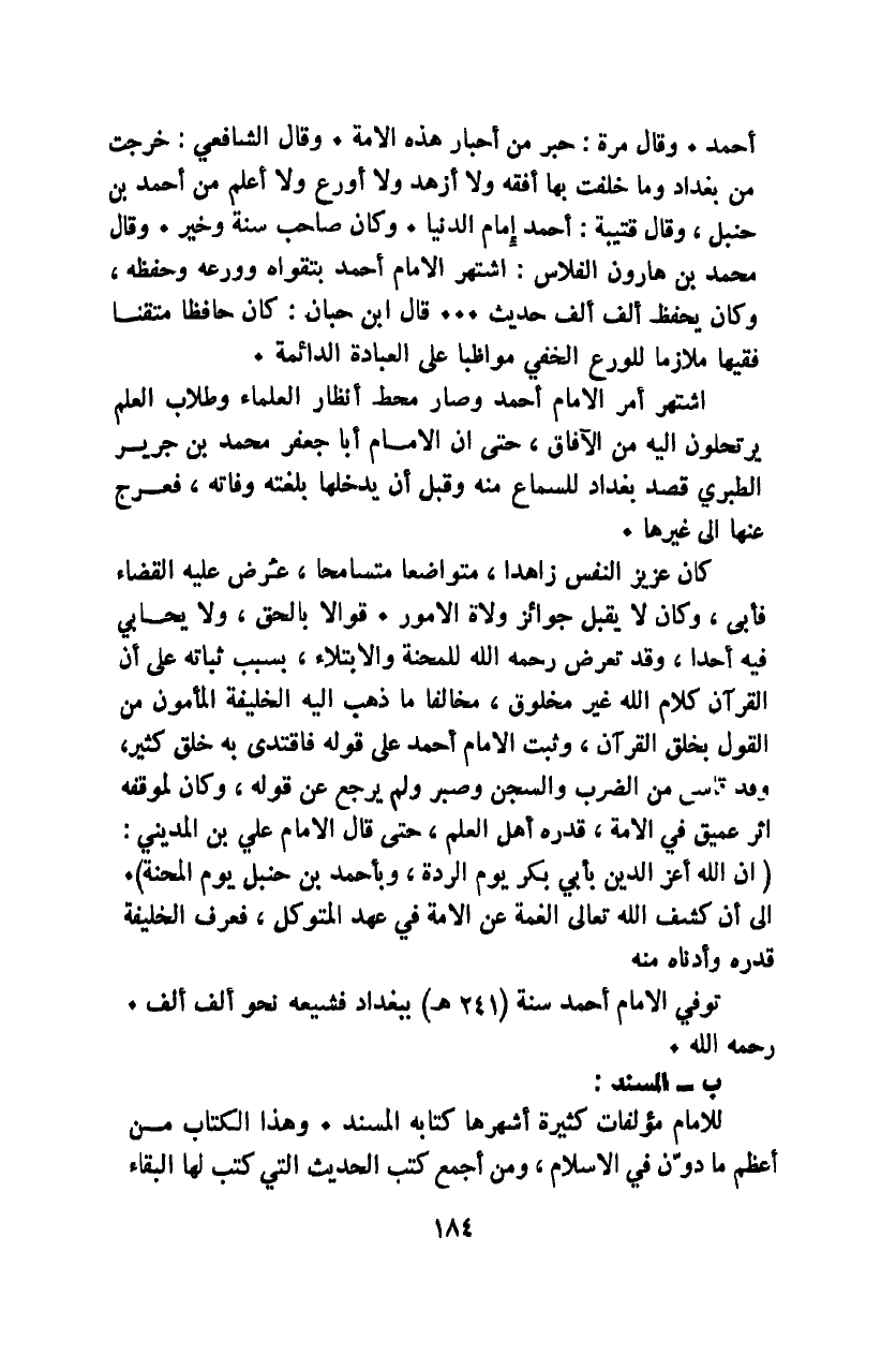 أحمد. وقال مرة: حبر من أحبار هذه الأمة. وقال الشافعي: خرجت من بغداد وما خلفت بها أفقه ولا أزهد ولا أورع ولا أعلم من أحمد بن حنبل، وقال قتيبة: أحمد إمام الدنيا. وكان صاحب سنة وخير. وقال محمد بن هارون الفلاس: اشتهر الإمام أحمد بتقواه وورعه وحفظه، وكان يحفظ ألف ألف حديث. قال ابن حبان: كان حافظًا متقنًا فقيهًا ملازمًا للورع الخفي مواظبًا على العبادة الدائمة.