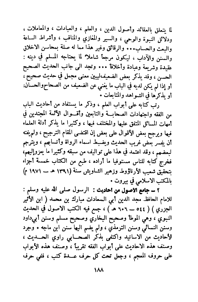 الرسول صلى الله عليه وسلم: للإمام الحافظ مجد الدين أبي السعادات مبارك بن محمد "ابن الأثير الجزري" "544 - 606هـ"، جمع فيه الكتب الأصول في الحديث النبوي، وهي الموطأ وصحيح البخاري وصحيح مسلم وسنن أبي داود وسنن النسائي وسنن الترمذي، ولم يضم إليها سنن ابن ماجه. وجرد الأحاديث من الأسانيد واكتفى بذكر الصحابي راوي الحديث، وصنف هذه الأحاديث على أبواب الفقه تقريبًا، وصنف هذه الأبواب على حروف المعجم، وجعل تحت كل حرف عدة كتب؛ ففي حرف