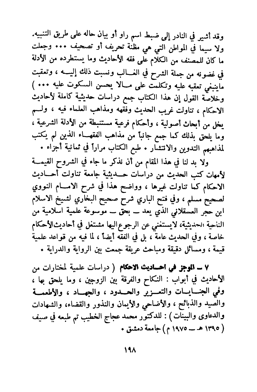 "دراسات علمية لمختارات من الأحاديث في أبواب: النكاح والفرقة بين الزوجين، وما يلحق بها، وفي الجنايات والتعزير والحدود، والجهاد، والأطعمة والصيد والذبائح، والأضاحي والأيمان والنذور والقضاء، والشهادات والدعاوى والبينات": للدكتور محمد عجاج الخطيب تم طبعه في صيف "1395هـ - 1975م" جامعة دمشق.