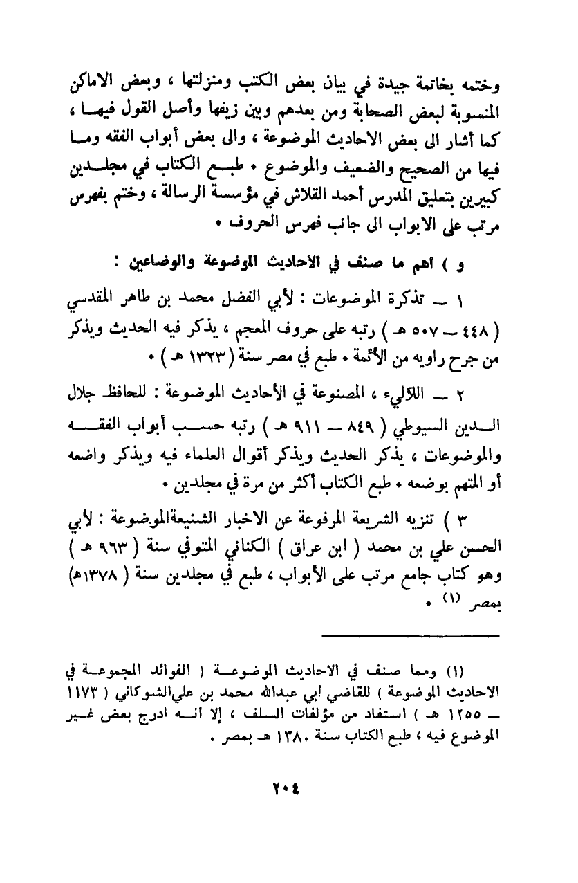 1 ومما صنف في الأحاديث الموضوعة "الفوائد المجموعة في الأحاديث الموضوعة" للقاضي أبي عبد الله محمد بن علي الشوكاني"1173 - 1255هـ" استفاد من مؤلفات السلف؛ إلا أنه أدرج بعض غير الموضوع فيه، طبع الكتاب سنة 1380هـ بمصر.