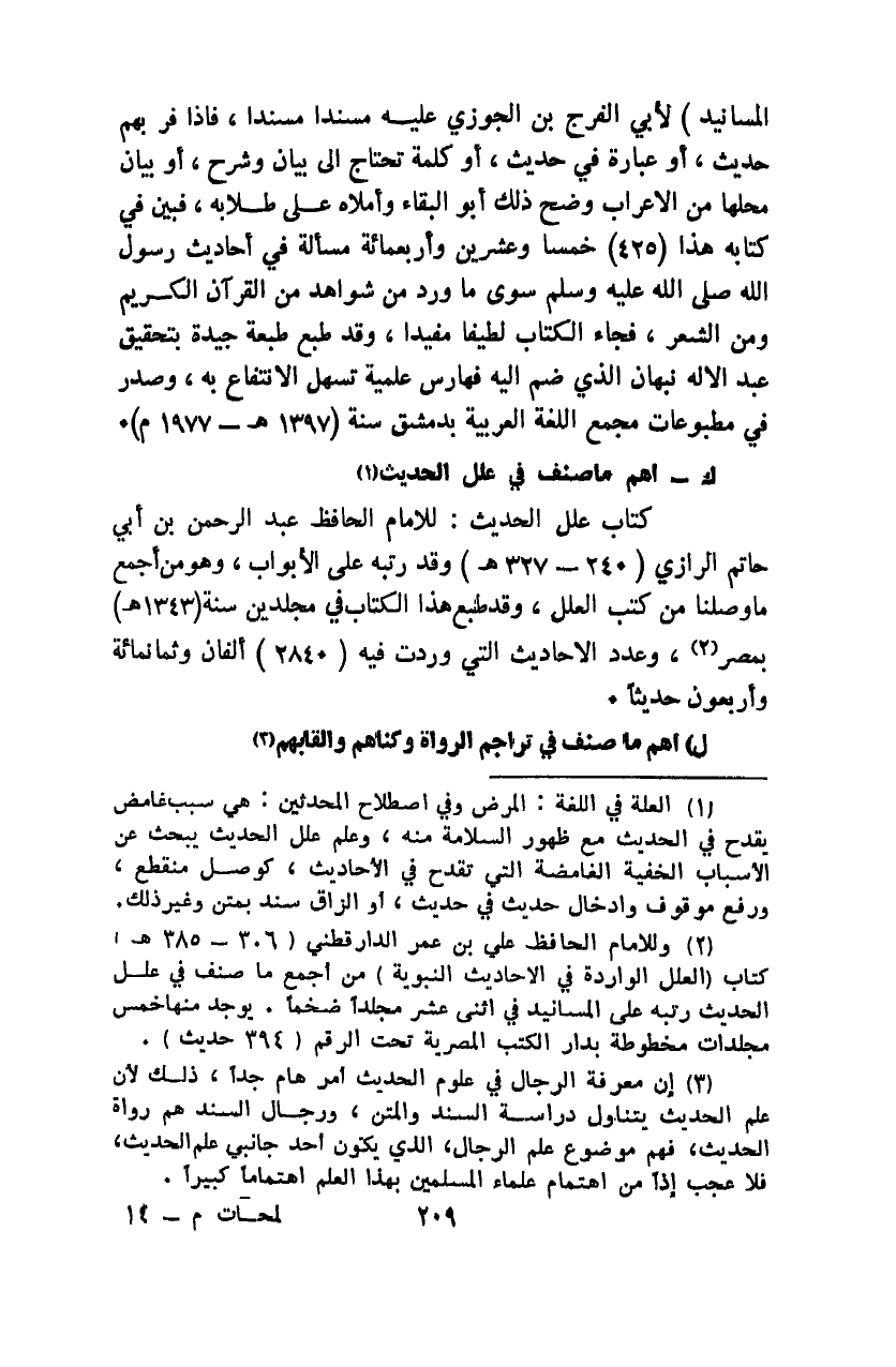 2 وللإمام الحافظ علي بن عمر الدارقطني "306 - 385هـ" كتاب "العلل الواردة في الأحاديث النبوية" من أجمع ما صنف في علل الحديث رتبه على المسانيد في اثنى عشر مجلدًا ضخمًا. يوجد منها خمس مجلدات مخطوطة بدار الكتب المصرية تحت الرقم 394 حديث.
