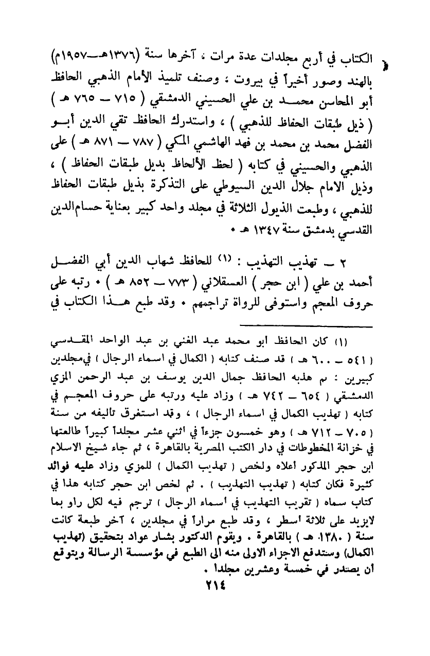 1 كان الحافظ أبو محمد عبد الغني بن عبد الواحد المقدسي "541 - 600هـ" قد صنف كتابه "الكمال في أسماء الرجال" في مجلدين كبيرين، ثم هذبه الحافظ جمال الدين يوسف بن عبد الرحمن المزي الدمشقي "654 - 742هـ"، وزاد عليه ورتبه على حروف المعجم في كتابه تهذيب الكمال في أسماء الرجال، وقد استغرق تأليفه من سنة "705 - 712هـ" وهو خمسون جزءًا في اثنى عشر مجلدًا كبيرًا طالعتها في خزانة المخطوطات في دار الكتب المصرية بالقاهرة، ثم جاء شيخ الإسلام ابن حجر المذكور أعلاه ولخص "تهذيب الكمال" للمزي وزاد عليه فوائد كثيرة؛ فكان كتابه "تهذيب التهذيب". ثم لخص ابن حجر كتابه هذا في كتاب سماه تقريب التهذيب في أسماء الرجال ترجم فيه لكل راو بما لا يزيد على ثلاثة أسطر، وقد طبع مرارًا في مجلدين، آخر طبعة كانت سنة "1380هـ" بالقاهرة. ويقوم الدكتور بشار عواد بتحقيق تهذيب الكمال وستدفع الأجزاء الأولى منه إلى الطبع في مؤسسة الرسالة ويتوقع أن يصدر في خمس وعشرين مجلدًا.