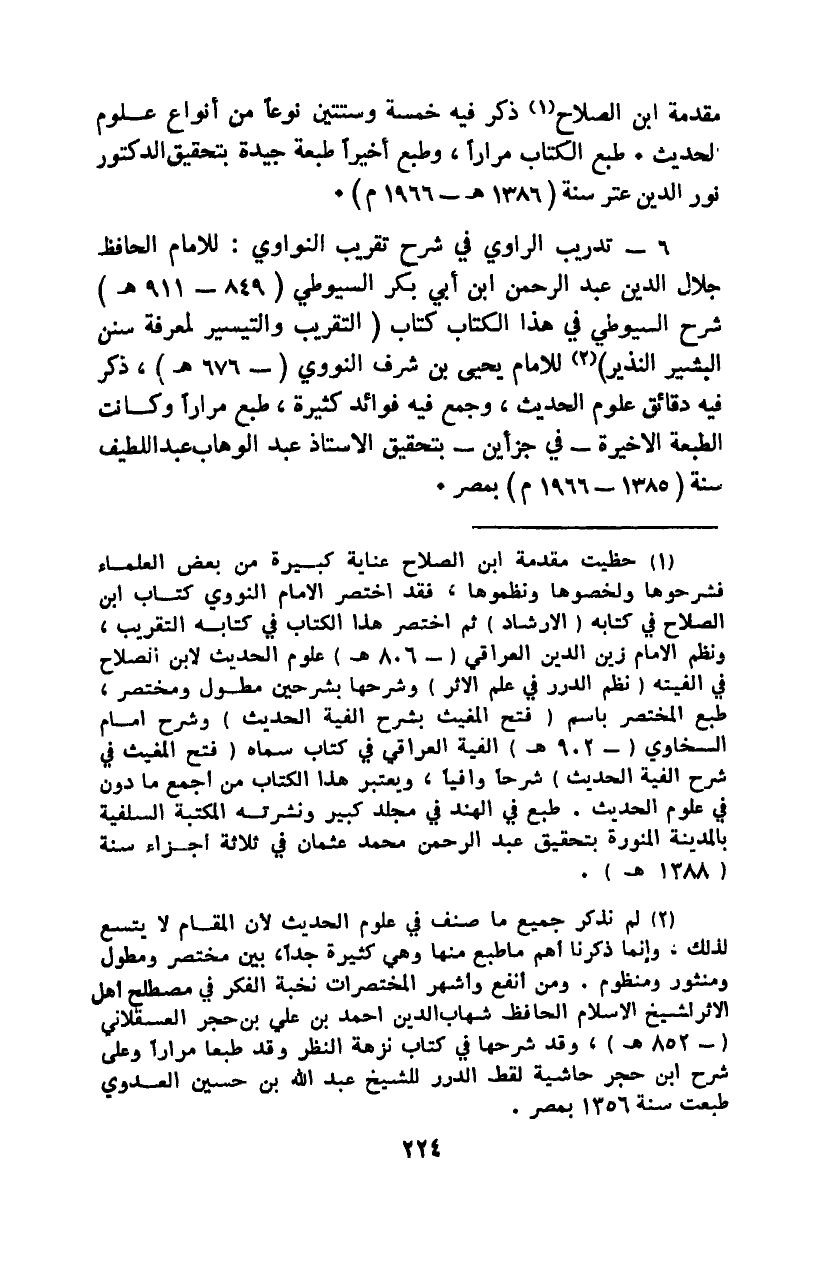 2 لم نذكرجميع ما صنف في علوم الحديث لأن المقام لا يتسع لذلك؛ وإنما ذكرنا أهم ما طبع منها وهي كثيرة جدًا، بين مختصر ومطول ومنثور ومنظوم. ومن أنفع وأشهر المختصرات "نخبة الفكر في مصطلح أهل الأثر" لشيخ الإسلام الحافظ شهاب الدين أحمد بن علي بن حجر العسقلاني "852هـ"، وقد شرحها في كتاب نزهة النظر وقد طبعًا مرارًا وعلى شرح ابن حجر حاشية لقط الدرر للشيخ عبد الله بن حسين العدوي طبعت سنة 1356 بمصر.