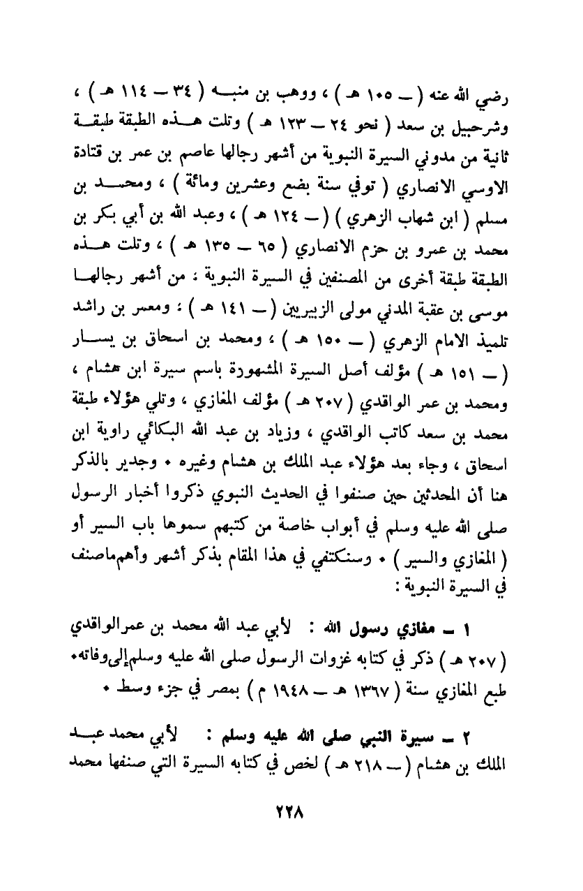 رضي الله عنه "- 105هـ"، ووهب بن منبه "34 - 114هـ"، وشرحبيل بن سعد "نحو 24 - 123هـ" وتلت هذه الطبقة طبقة ثانية من مدوني السيرة النبوية من أشهر رجالها عاصم بن عمر بن قتادة الأوسي الأنصاري "توفي سنة بضع وعشرين ومائة"، ومحمد بن مسلم "ابن شهاب الزهري" "- 124هـ"، وعبد الله بن أبي بكر بن محمد بن عمرو بن حزم الأنصاري "65- 135هـ"، وتلت هذه الطبقة طبقة أخرى من المصنفين في السيرة، من أشهر رجالها موسى بن عقبة المدني مولى الزبيريين "141هـ"، ومعمر بن راشد تلميذ الإمام الزهري "150هـ"، ومحمد بن إسحاق بن يسار "151هـ" مؤلف أصل السيرة المشهورة باسم سيرة ابن هشام، ومحمد بن عمر الواقدي "207هـ" مؤلف المغازي، وتلي هؤلاء طبقة محمد بن سعد كاتب الواقدي، وزياد بن عبد الله البكائي راوية ابن إسحاق، وجاء بعد هؤلاء عبد الملك بن هشام وغيره. وجدير بالذكر هنا أن المحدثين حين صنفوا في الحديث النبوي ذكروا أخبار الرسول صلى الله عليه وسلم في أبواب خاصة من كتبهم سموها باب السير أو المغازي والسير. وسنكتفي في هذا المقام بذكر أشهر وأهم ما صنف في السيرة النبوية: