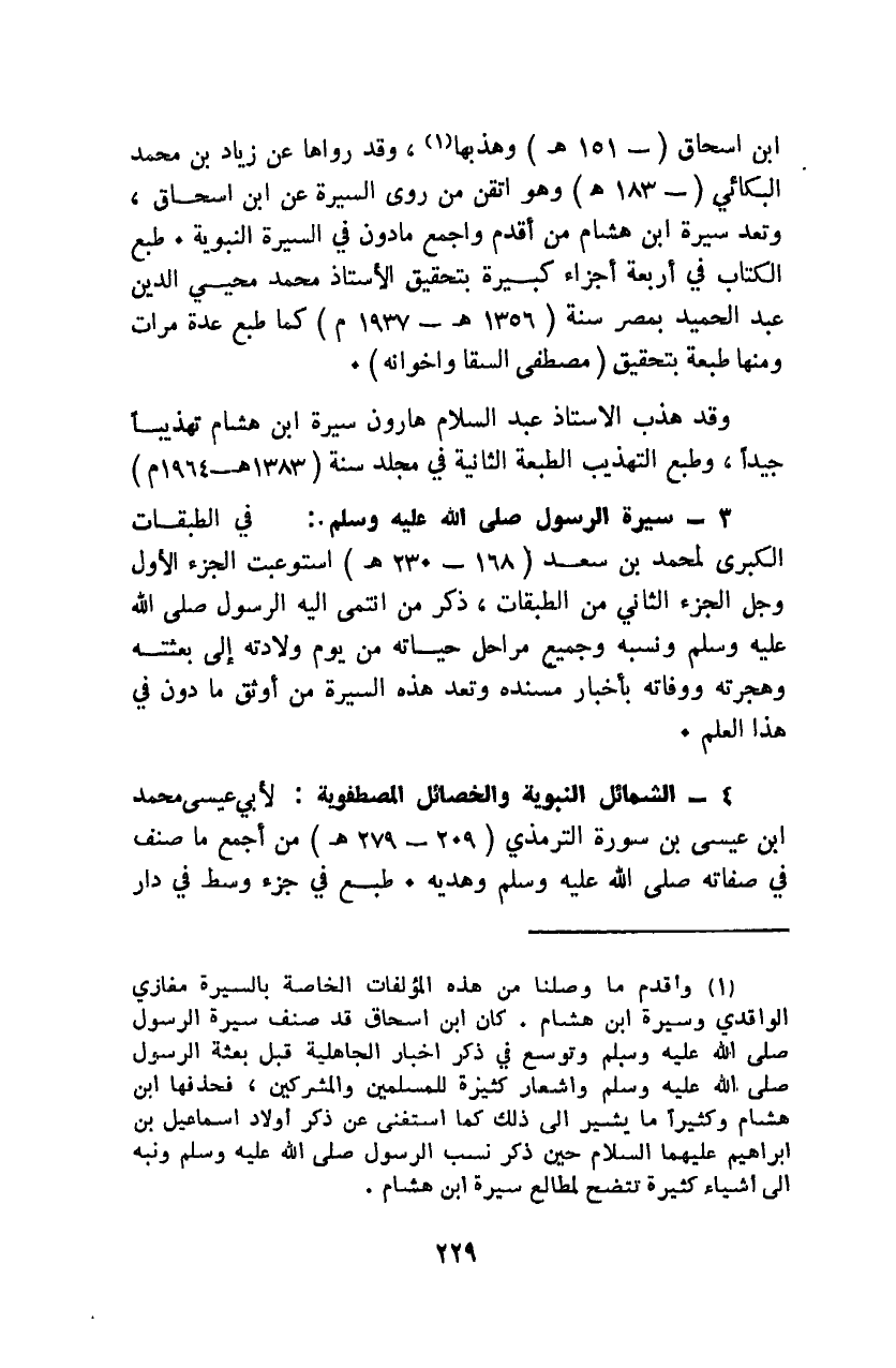 "ابن إسحاق" "151هـ" وهذبها1، وقد رواها عن زياد بن محمد البكائي "183هـ"، وهو أتقن من روى السيرة عن ابن إسحاق، وتعد سيرة ابن هشام من أقدم وأجمع ما دون في السيرة النبوية. طبع الكتاب في أربعة أجزاء كبيرة بتحقيق الأستاذ محمد محيي الدين عبد الحميد بمصر سنة "1356هـ - 1937م" كما طبع عدة مرات ومنها طبعة بتحقيق "مصطفى السقا وإخوانه".