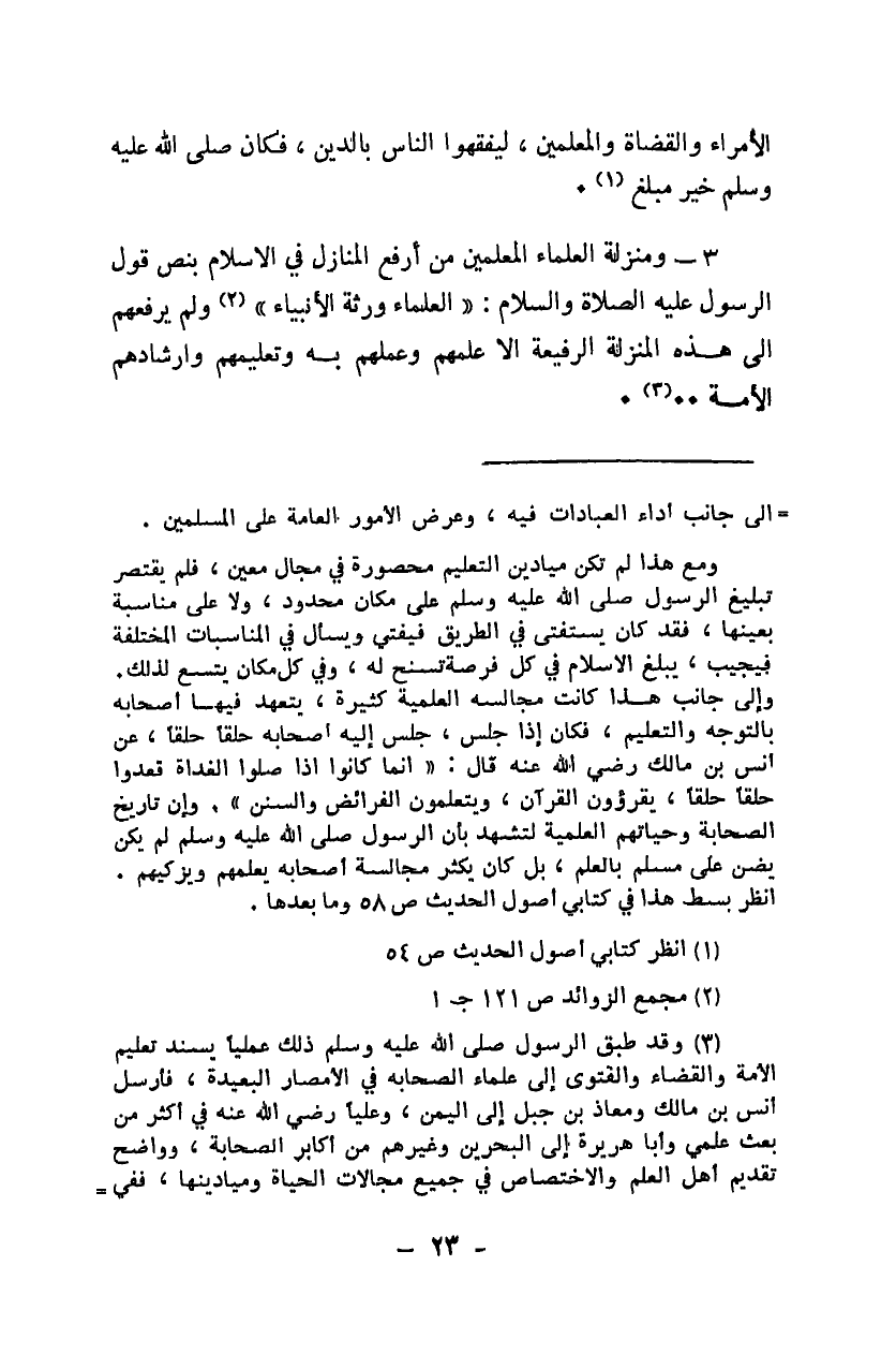 ومع هذا لم تكن ميادين التعليم محصورة في مجال معين؛ فلم يقتصر تبليغ الرسول صلى الله عليه وسلم على مكان محدود، ولا على مناسبة بعينها؛ فقد كان يستفتى في الطريق فيفتي ويسأل في المناسبات المختلفة فيجيب، يبلغ الإسلام في كل فرصة تسنح له، وفي كل مكان يتسع لذلك. وإلى جانب هذا كانت مجالسه العلمية كثيرة يتعهد فيها أصحابه بالتوجه والتعليم؛ فكان إذا جلس جلس إليه أصحابه حلقًا حلقًا، عن أنس بن مالك رضي الله عنه قال: "إنما كانوا إذا صلوا الغداة قعدوا حلقًا حلقًا، يقرءون القرآن، ويتعلمون الفرائض والسنن". وإن تاريخ الصحابة وحياتهم العلمية لتشهد بأن الرسول صلى الله عليه وسلم لم يكن يضن على مسلم بالعلم؛ بل كان يكثر مجالسة أصحابه يعلمهم ويزكيهم. انظر بسط هذا في كتابي "أصول الحديث" ص 58 وما بعدها.