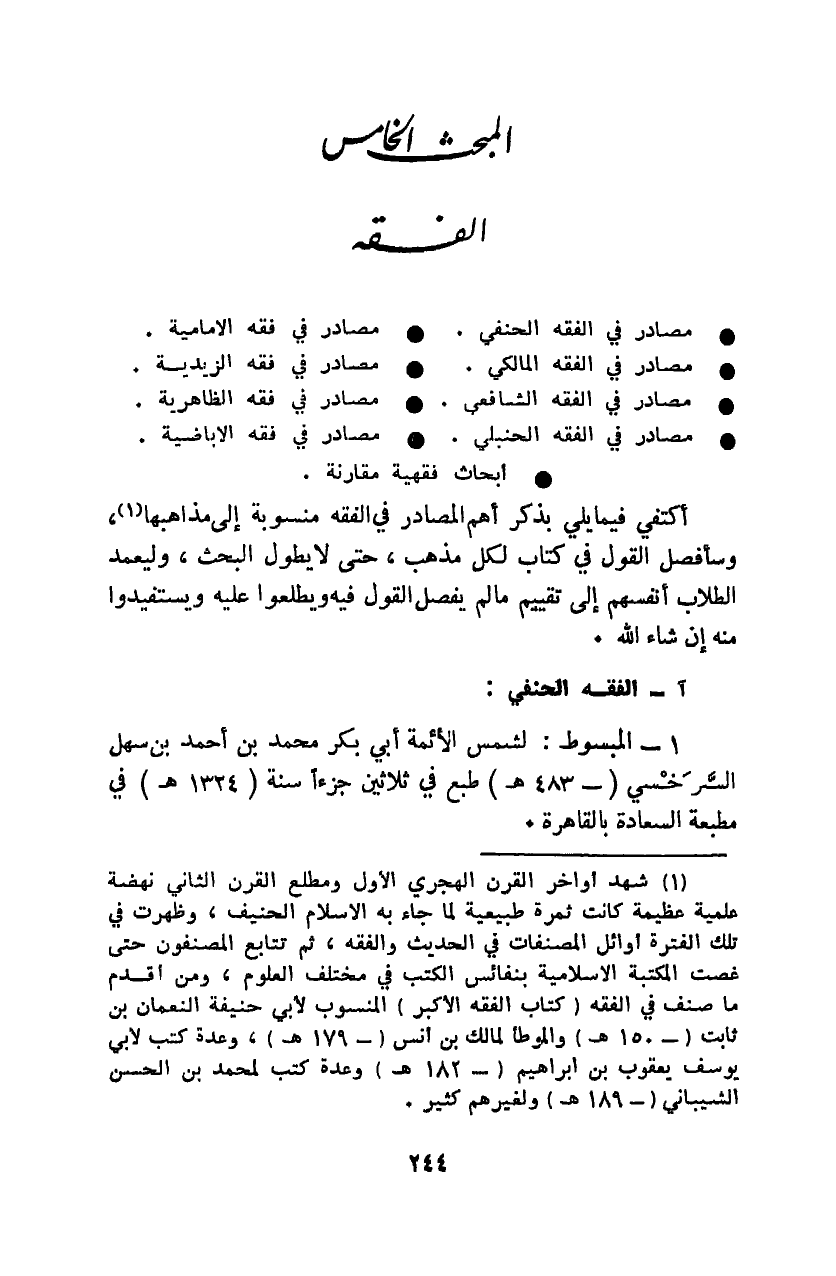 أكتفي فيما يلي بذكر أهم المصادر في الفقه منسوبة إلى مذاهبها1، وسأفصل القول في كتاب لكل مذهب، حتى لا يطول البحث، وليعمد الطلاب أنفسهم إلى تقييم ما لم يفصل القول فيه ويطلعوا عليه ويستفيدوا منه إن شاء الله.