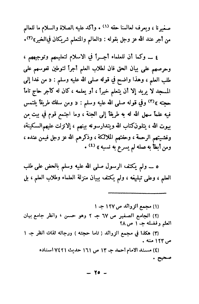 صغيرنا، ويعرف لعالمنا حقه" 1. وأكد عليه الصلاة والسلام ما للعالم من أجر عند الله عز وجل بقوله: "العالم والمتعلم شريكان في الخير" 2.