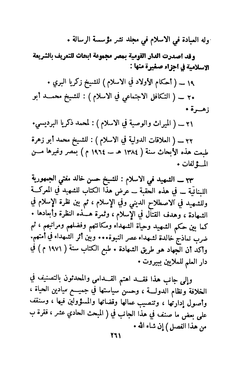 23- الشهيد في الإسلام: للشيخ حسن خالد مفتي الجمهورية اللبنانية -في هذه الحقبة- عرض هذا الكتاب للشهيد في المعركة وللشهيد في الاصطلاح الديني وفي الإسلام، ثم بين نظرة الإسلام في الشهادة، وهدف القتال في الإسلام، وثمرة هذه النظرة وأبعادها. كما بين حكم الشهيد وحياة الشهداء ومكانتهم وفضلهم ومراتبهم، ثم ضرب نماذج خالدة لشهداء عصر النبوة ... وبين أثر الشهداء في أمتهم، وأكد أن الجهاد هو طريق الشهادة. طبع الكتاب سنة "1971م" في دار العلم للملايين ببيروت.