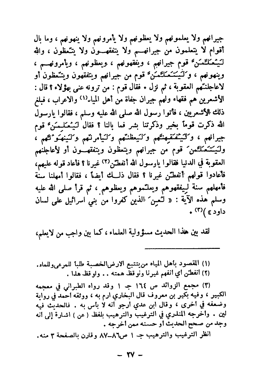 جيرانهم ولا يلعمونهم ولا يعظونهم ولا يأمرونهم ولا ينهونهم، وما بال أقوام لا يتعلمون من جيرانهم ولا يتفقهون ولا يتعظون، والله ليعلمن قوم جيرانهم، ويفقهونهم، ويعظونهم، ويأمرونهم، وينهونهم، وليتعلمن قوم من جيرانهم ويتفقهون ويتعظون أو لأعاجلنهم العقوبة"، ثم نزل. فقال قوم: من ترونه عني بهؤلاء؟ قال: الأشعرين: هم فقهاء ولهم جيران جفاة من أهل المياه1 والأعراب؛ فبلغ ذلك الأشعرين، فأتوا رسول الله صلى الله عليه وسلم، فقالوا يا رسول الله ذكرت قومًا بخير وذكرتنا بشر فما بالنا؟ فقال: "ليعلمن قوم جيرانهم، وليثقفنهم وليعظنهم وليأمرنهم ولينهونهم، وليتعلمن قوم من جيرانهم ويتعظون ويتفقهون أو لأعاجلنهم العقوبة في الدنيا" فقالوا: يا رسول الله أنفطن2 غيرنا؟ فأعاد قوله عليهم؛ فأعادوا قولهم أنفطن غيرنا؟ فقال ذلك أيضا؛ فقالوا أمهلنا سنة فأمهلهم سنة ليفقهوهم ويعلموهم ويعظوهم، ثم قرأ صلى الله عليه وسلم هذه الآية: {لُعِنَ الَّذِينَ كَفَرُوا مِنْ بَنِي إِسْرَائِيلَ عَلَى لِسَانِ دَاوُودَ} 3.