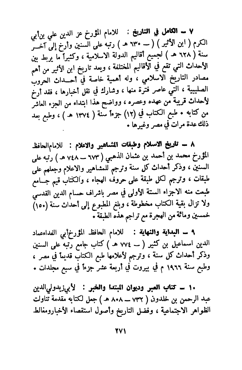 للإمام الحافظ المؤرخ أبي الفداء عماد الدين إسماعيل بن كثير "774هـ" كتاب جامع رتبه على السنين وذكر أحداث كل سنة، وترجم لأعلامها طبع الكتاب قديمًا في مصر، وطبع سنة 1966م في بيروت في أربعة عشر جزءًا في سبع مجلدات.