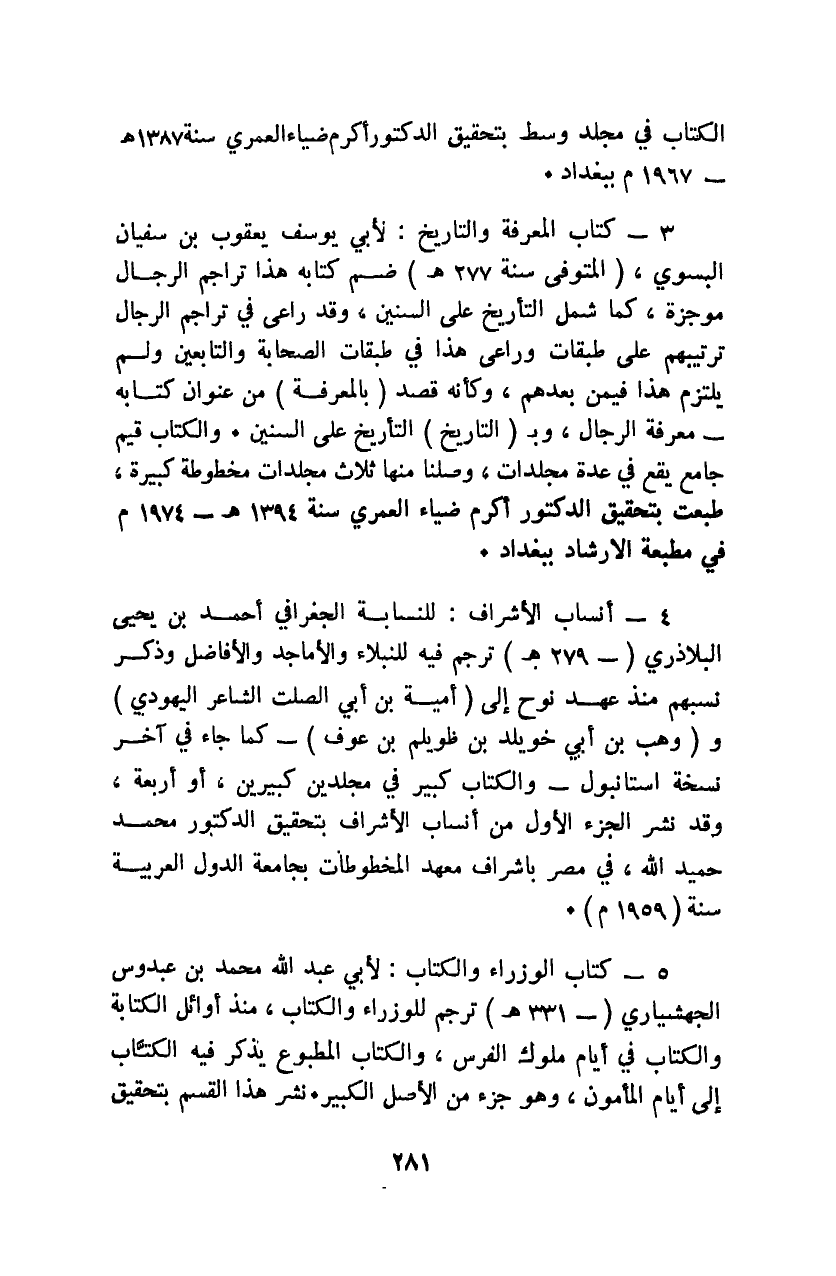 الكتاب في مجلد وسط بتحقيق الدكتور أكرم ضياء العمري سنة 1387هـ - 1967م ببغداد.