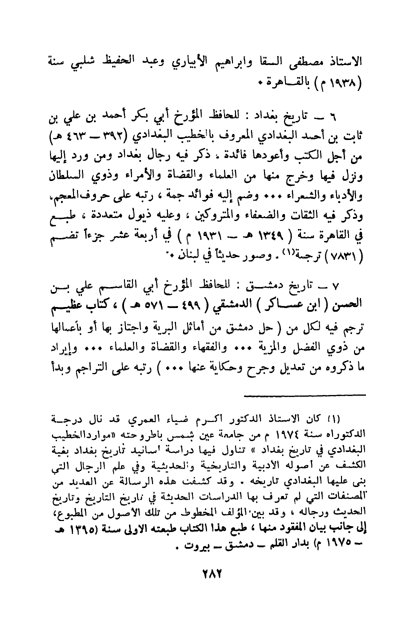 1 كان الأستاذ الدكتور أكرم ضياء العمري قد نال درجة الدكتوراه سنة 1974م من جامعة عين شمس بأطروحته "موارد الخطيب البغدادي في تاريخ بغداد" تناول فيها دراسة أسانيد تاريخ بغداد بغية الكشف عن أصوله الأدبية والتاريخية والحديثية وفي علم الرجال التي بنى عليها البغدادي تاريخه، وقد كشفت هذه الرسالة عن العديد من المصنفات التي لم تعرف بها الدراسات الحديثة في تاريخ التأريخ وتاريخ الحديث ورجاله، وقد بين المؤلف المخطوط من تلك الأصول من المطبوع، إلى جانب بيان المفقود منها، طبع هذا الكتاب طبعته الأولى سنة "1395هـ - 1975م" بدار القلم -دمشق- بيروت.