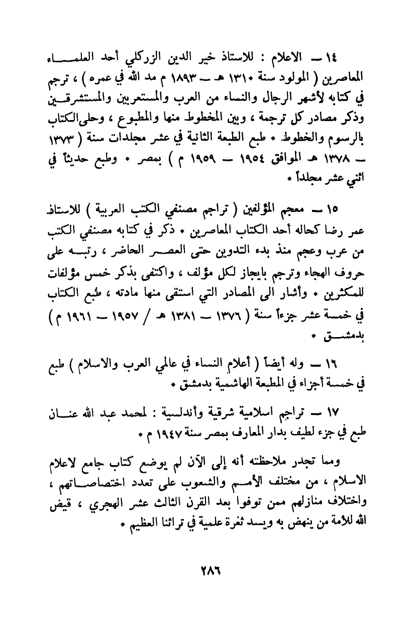 ومما تجدر ملاحظته أنه إلى الآن لم يوضع كتاب جامع لأعلام الإسلام، من مختلف الأمم والشعوب على تعدد اختصاصاتهم، واختلاف منازلهم ممن توفوا بعد القرن الثالث عشر الهجري، قيض الله للأمة من ينهض به ويسد ثغرة علمية في تراثنا العظيم.