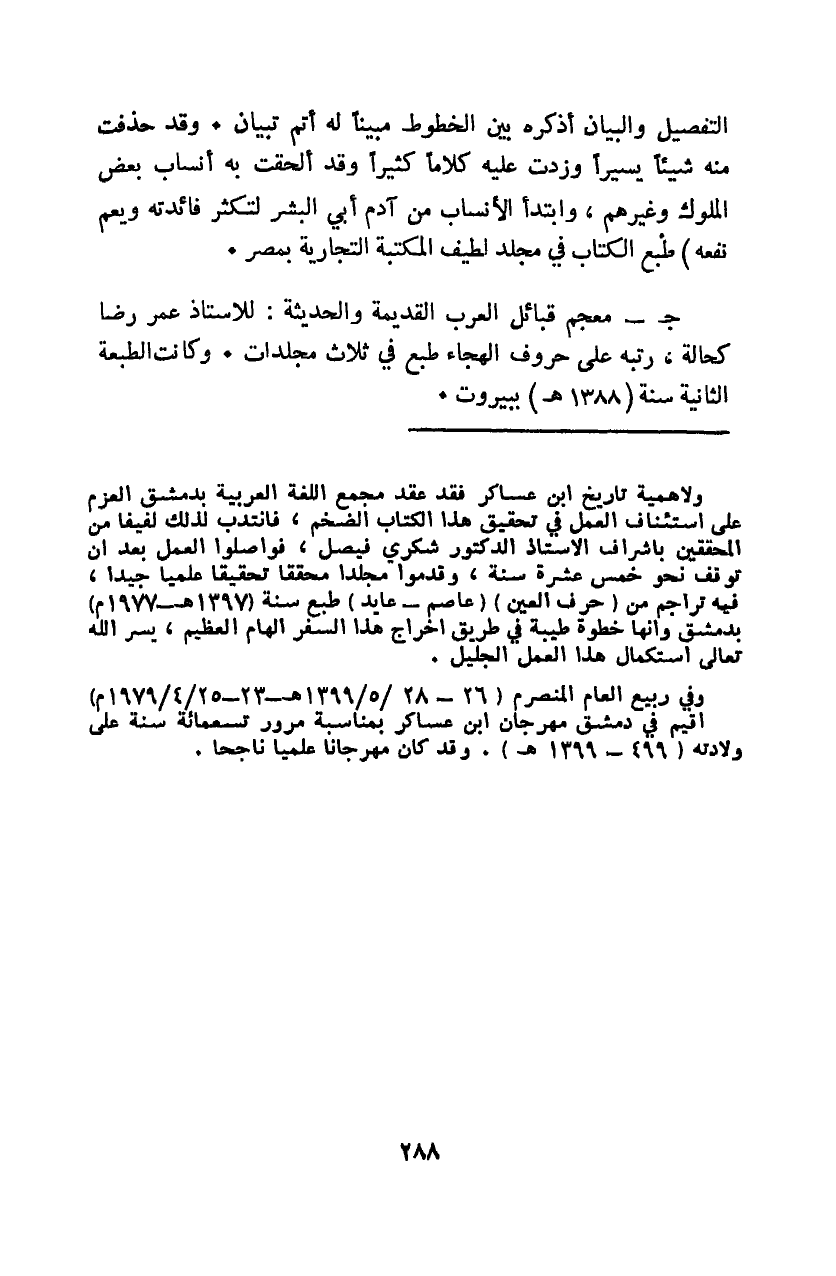 التفصيل والبيان أذكره بين الخطوط مبينا له أتم تبيان. وقد حذفت منه شيئا يسيرا وزدت عليه كلاما كثيرا وقد ألحقت به أنساب بعض الملوك وغيرهم، وأبتدئ الأنساب من آدم أبي البشر لتكثر فائدته ويعم نفعه طبع الكتاب في مجلد لطيف المكتبة التجارية بمصر.