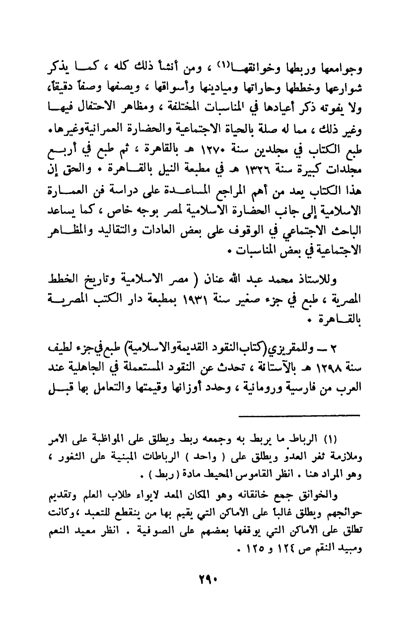وجوامعها وربطها وخوانقها1، ومن أنشأ ذلك كله، كما يذكر شوارعها وخططها وحاراتها وميادينها وأسواقها، ويصفها وصفًا دقيقًا، ولا يفوته ذكر أعيادها في المناسبات المختلفة، ومظاهر الاحتفال فيها وغير ذلك، مما له صلة بالحياة الاجتماعية والحضارة العمرانية وغيرها. طبع الكتاب في مجلدين سنة "1270هـ" بالقاهرة، ثم طبع في أربع مجلدات كبيرة سنة "1326هـ" في مطبعة النيل بالقاهرة. والحق أن هذا الكتاب يعد من أهم المراجع المساعدة على دراسة فن العمارة الإسلامية إلى جانب الحضارة الإسلامية لمصر بوجه خاص، كما يساعد الباحث الاجتماعي في الوقوف على بعض العادات والتقاليد والمظاهر الاجتماعية في بعض المناسبات.