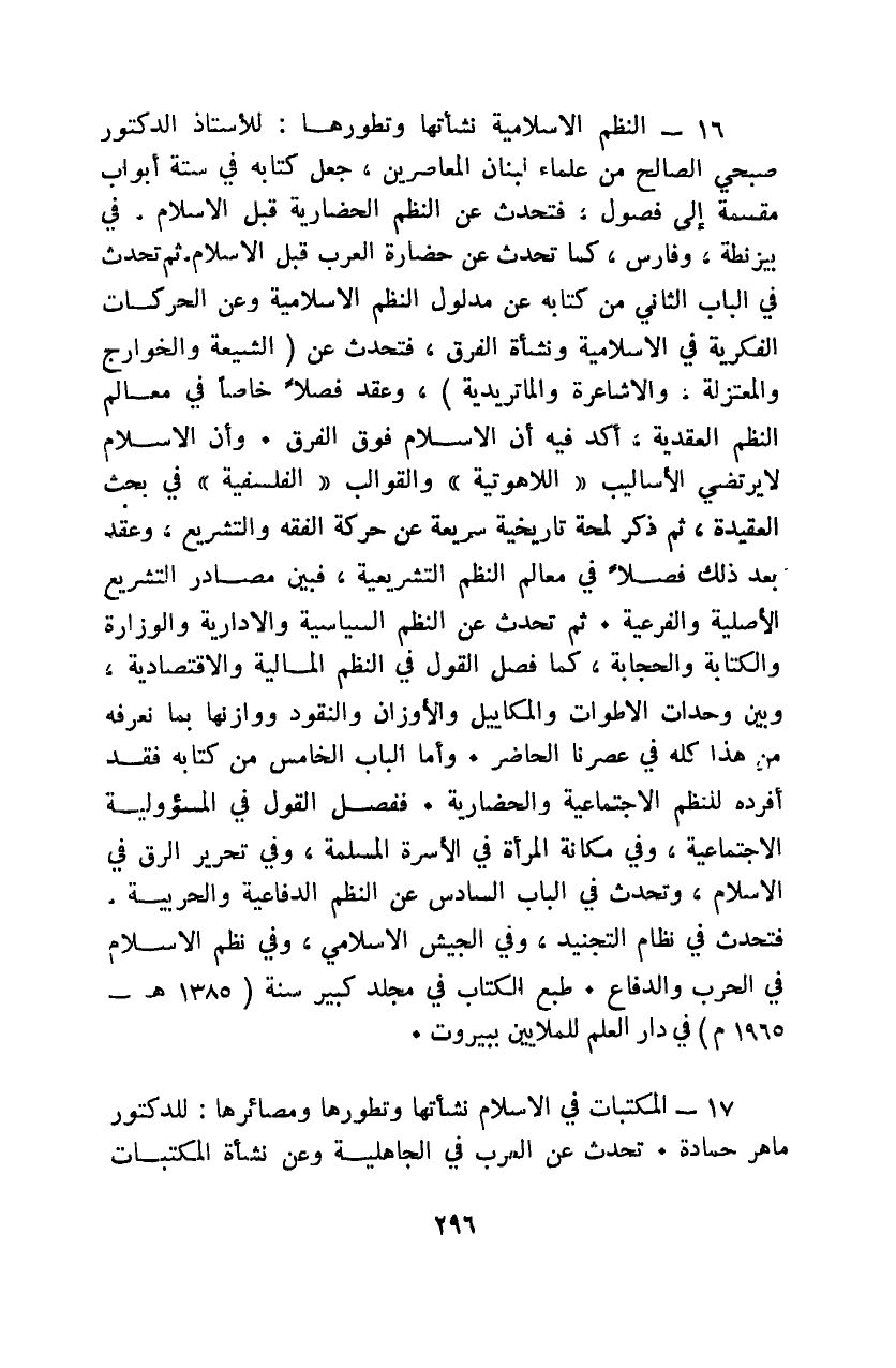 للأستاذ الدكتور صبحي الصالح من علماء لبنان المعاصرين، جعل كتابه في ستة أبواب مقسمة إلى فصول؛ فتحدث عن النظم الحضارية قبل الإسلام، في بيزنطة، وفارس، كما تحدث عن حضارة العرب قبل الإسلام، ثم تحدث في الباب الثاني من كتابه عن مدلول النظم الإسلامية وعن الحركات الفكرية في الإسلام ونشأة الفرق؛ فتحدث عن "الشيعة والخوارج والمعتزلة، والأشاعرة والماتريدية"، وعقد فصلًا خاصًا في معالم النظم العقدية، أكد فيه أن الإسلام فوق الفرق. وأن الإسلام لا يرتضي الأساليب اللاهوتية والقوالب الفلسفية في بحث العقيدة، ثم ذكر لمحة تاريخية سريعة عن حركة الفقه والتشريع، وعقد بعد ذلك فصلًا في معالم النظم التشريعية؛ فبين مصادر التشريع الأصلية والفرعية. ثم تحدث عن النظم السياسية والإدارية والوزارة والكتابة والحجابة، كما فصل القول في النظم المالية والاقتصادية، وبين وحدات الأطوال والمكاييل والأوزان ووازنها بما نعرفه من هذا كله في عصرنا الحاضر. وأما الباب الخامس من كتابه؛ فقد أفرده للنظم الاجتماعية والحضارية؛ ففصل القول في المسئولية الاجتماعية، وفي مكانة المرأة في الأسرة المسلمة، وفي تحرير الرق في الإسلام، وتحدث في الباب السادس عن النظم الدفاعية والحربية؛ فتحدث في نظام التجنيد، وفي الجيش الإسلامي، وفي نظم الإسلام في الحرب والدفاع. طبع الكتاب في مجلد كبير سنة "1385هـ - 1965م" في دار العلم للملايين ببيروت.
