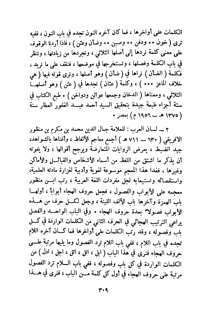 الكلمات على أواخرها؛ فما كان أخره النون تجده في باب النون؛ ففيه ترى "خون ... ودفن.. وصبن.. وضأن وعثن"؛ فإذا أردنا الوقوف على معنى كلمة نردها إلى أصلها الثلاثي، ونجردها من زيادتها، وننظر في باب الكلمة وفصلها، ونستخرجها في موضعها؛ فنقف على ما نريد؛ فكلمة "الضأن" نراها في "ضأن" وهو أصلها، ونرى قوله فيها "هي خلاف الماعز ... "، وكلمة "عثان" نجدها في "عثن" وهو أصلها الثلاثي، ومعناها "الدخان وجمعها عواثن ودواخن". طبع الكتاب في ستة أجزاء طبعة جيدة بتحقيق السيد أحمد عبد الغفور العطار سنة "1375هـ - 2956م" بمصر.