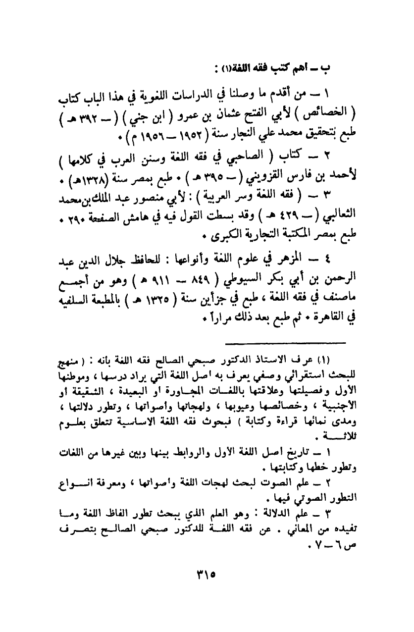 1 عرف الأستاذ الدكتور صبحي الصالح فقه اللغة بأنه: "منهج للبحث استقرائي وصفي يعرف به أصل اللغة التي يراد درسها، وموطنها الأول وفصيلتها وعلاقتها باللغات المجاورة أو البعيدة، الشقيقة أو الأجنبية، وخصائصها وعيوبها، ولهجاتها وأصواتها، وتطور دلالتها، ومدى نمائها قراءة وكتابة"؛ فبحوث فقه اللغة الأساسية تتعلق بعلوم ثلاثة.