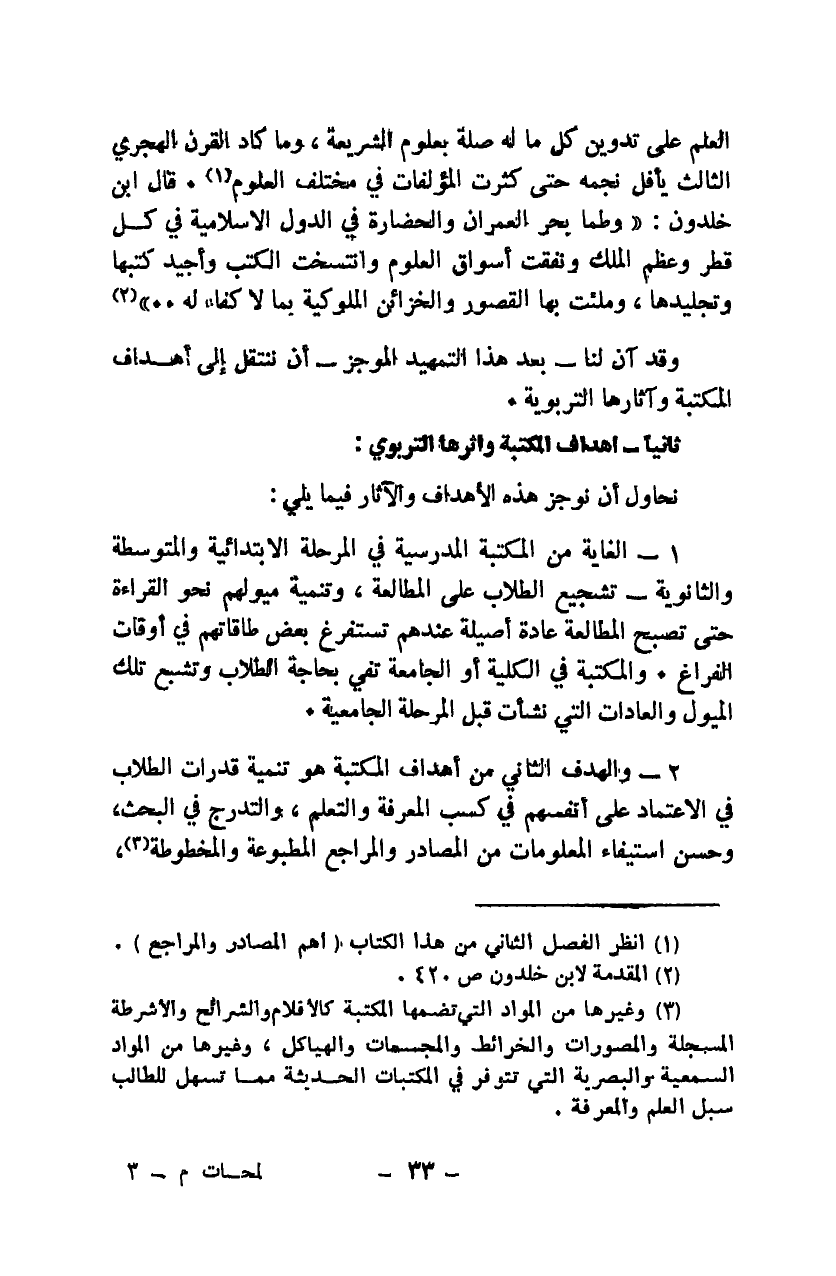 وقد آن لنا - بعد هذا التمهيد الموجز - أن ننتقل إلى أهداف المكتبة وآثارها التربوية.
