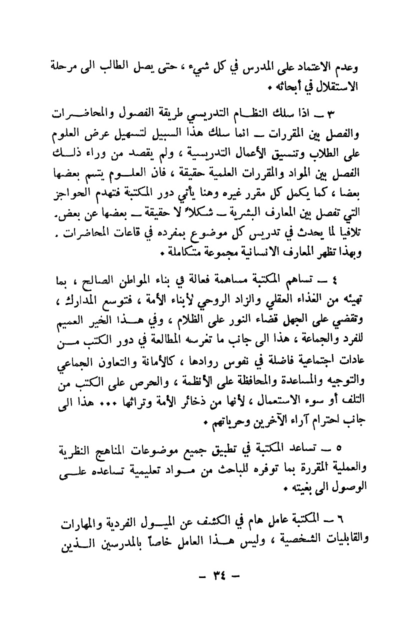3- إذا سلك النظام التدريسي طريقة الفصول والمحاضرات والفصل بين المقررات؛ إنما سلك هذا السبيل لتسهيل عرض العلوم على الطلاب وتنسيق الأعمال التدريسية، ولم يقصد من وراء ذلك الفصل بين المواد والمقررات العلمية حقيقة؛ فإن العلوم يتمم بعضها بعضًا، كما يكمل كل مقرر غيره وهنا يأتي دور المكتبة فتهدم الحواجز التي تفصل بين المعارف البشرية -شكلًا لا حقيقة- بعضها عن بعض تلافيًا لما يحدث في تدريس كل موضوع بمفرده في قاعات المحاضرات. وبهذا تظهر المعارف الإنسانية مجموعة متكاملة.