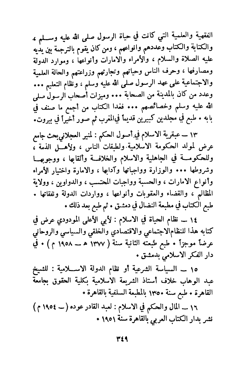 الفقهية والعلمية التي كانت في حياة الرسول صلى الله عليه وسلم، والكتابة والكتاب وعددهم وأنواعهم، ومن كان يقوم بالترجمة بين يديه عليه الصلاة والسلام، والأمراء والإمارات وأنواعها، وموارد الدولة ومصارفها، وحرف الناس وحياتهم وتجارتهم وزراعتهم والحالة العلمية والاجتماعية على عهد الرسول صلى الله عليه وسلم، ونظام التعليم ... وعدد من كان بالمدينة من الصحابة ... وميزات أصحاب الرسول صلى الله عليه وسلم وخصائصهم؛ فغدا الكتاب من أجمع ما صنف في بابه. طبع في مجلدين كبيرين قديمًا في المغرب ثم صور أخيرًا في بيروت.