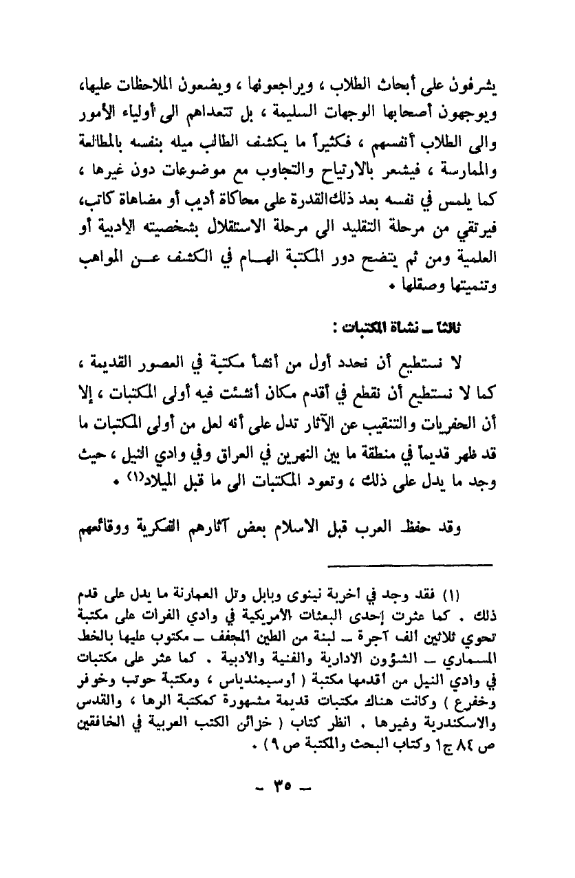 1 فقد وجد في أخربة نينوي وبابل وتل العمارنة ما يدل على قدم ذلك، كما عثرت إحدى البعثات الأمريكية في وادي الفرات على مكتبة تحوي ثلاثين ألف آجرة -لبنة من الطين المجفف- مكتوب عليها بالخط المسماري الشؤون الإدارية والفنية والأدبية. كما عثر على مكتبات في وادي النيل من أقدمها مكتبة أوسيمندياس، ومكتبة حوتب وخوفر وخفرع، وكانت هناك مكتبات قديمة مشهورة كمكتبة الرها، والقدس والإسكندرية وغيرها. انظر كتاب خزائن الكتب العربية في الخافقين ص84 ج1 وكتاب البحث والمكتبة ص9.
