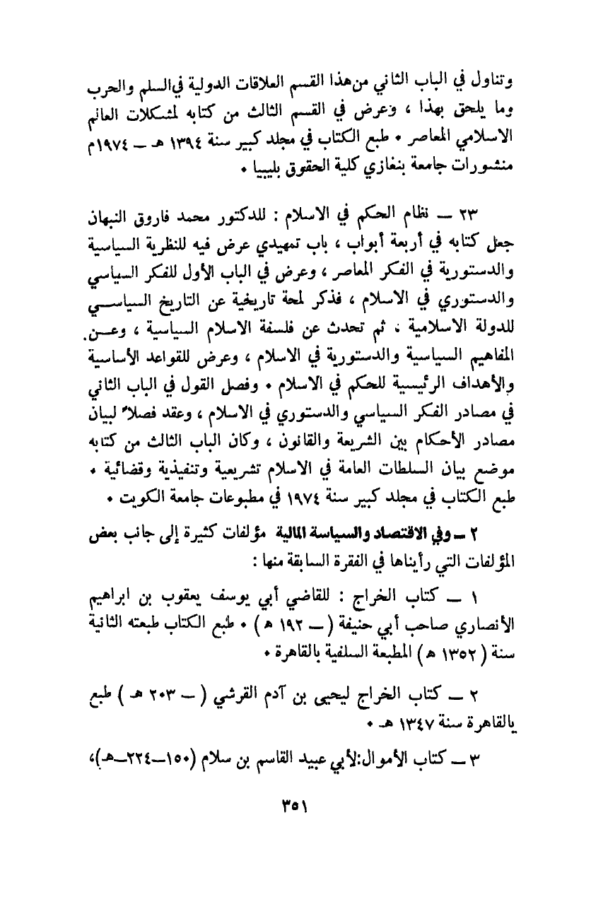 وتناول في الباب الثاني من هذا القسم العلاقات الدولية في السلم والحرب وما يلحق بهذا، وعرض في القسم الثالث من كتابه لمشكلات العالم الإسلامي المعاصر. طبع الكتاب في مجلد كبير سنة 1394هـ - 1974م منشورات جامعة بنغازي كلية الحقوق بليبيا.