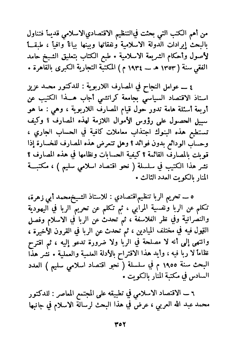 للأستاذ الشيخ محمد أبي زهرة، تكلم عن الربا ونفسية المرابي، ثم تكلم عن تحريم الربا في اليهودية والنصرانية وفي نظر الفلاسفة، ثم تحدث عن الربا في الإسلام وفصل القول فيه في مختلف الميادين، ثم تحدث عن الربا في القرون الأخيرة، وانتهى إلى أنه لا مصلحة في الربا ولا ضرورة تدعو إليه، ثم اقترح نظامًا لا ربا فيه، وأيد هذا الاقتراح بالأدلة العلمية والعملية. نشر هذا البحث سنة 1955م في سلسلة "نحو اقتصاد إسلامي سليم" العدد السادس في مكتبة المنار بالكويت.