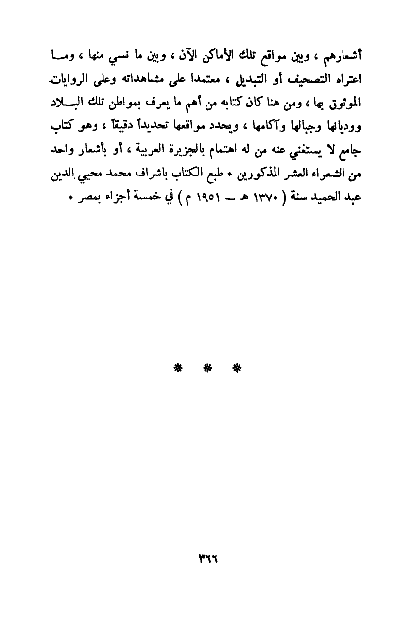 أشعارهم، وبين مواقع تلك الأماكن الآن، وبين ما نسي منها، وما اعتراه التصحيف أو التبديل، معتمدًا على مشاهداته وعلى الروايات الموثوق بها، ومن هنا كان كتابه من أهم ما يعرف بمواطن تلك البلاد ووديانها وجبالها وآكامها، ويحدد مواقعها تحديدًا دقيقًا، وهو كتاب جامع لا يستغنى عنه من له اهتمام بالجزيرة العربية، أو بأشعار واحد من الشعراء العشر المذكورين. طبع الكتاب بإشراف محمد محيي الدين عبد الحميد سنة "1370هـ-1951م" في خمسة أجزاء بمصر.