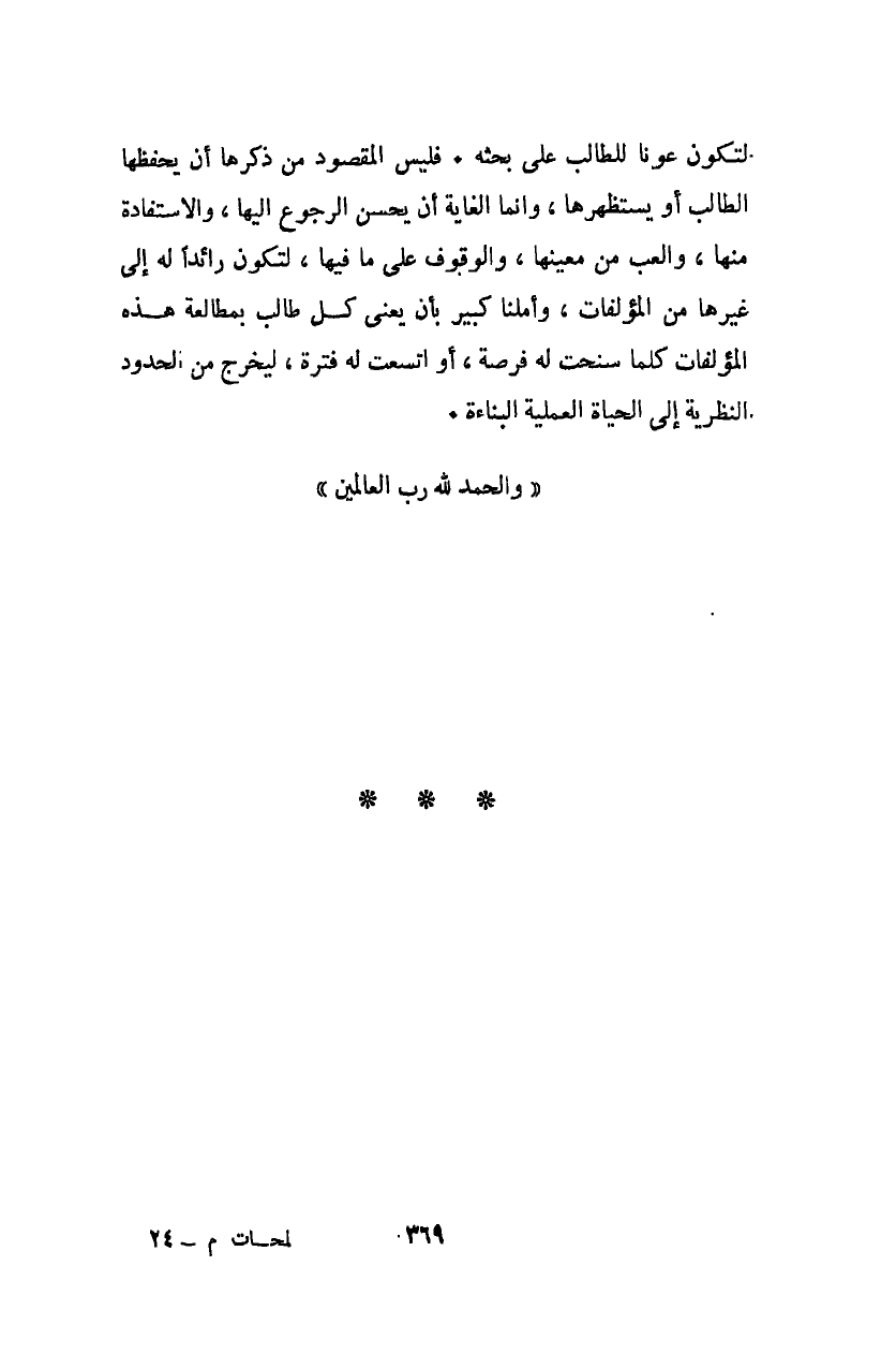 لتكون عونًا للطالب على بحثه؛ فليس المقصود من ذكرها أن يحفظها الطالب أو يستظهرها؛ وإنما الغاية أن يحسن الرجوع إليها، والاستفادة منها، والعب من معينها، والوقوف على ما فيها، لتكون رائدًا له إلى غيرها من المؤلفات، وأملنا كبير بأن يعني كل طالب بمطالعة هذه المؤلفات كلما سنحت له فرصة، أو اتسعت له فترة، ليخرج من الحدود النظرية إلى الحياة العملية البناءة.