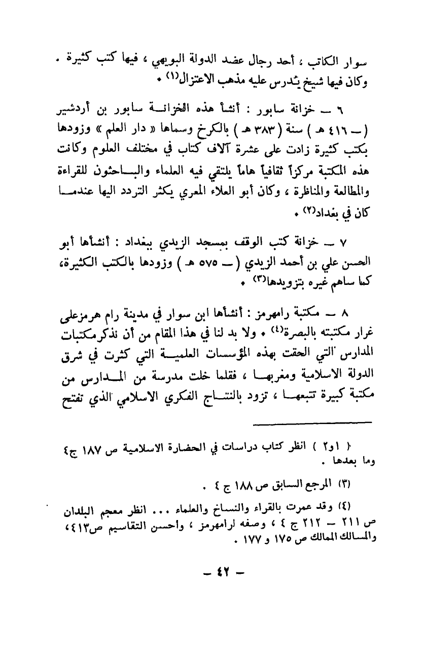أنشأها ابن سوار في مدينة رام هرمز على غرار مكتبة بالبصرة1. ولا بد لنا في هذا المقام من أن نذكر مكتبات المدارس التي ألقحت بهذه المؤسسات العلمية التي كثرت في شرق الدولة الإسلامية ومغربها، فقلما خلت مدرسة من المدارس من مكتبة كبيرة تتبعها، تزود بالنتاج الفكري الإسلامي الذي تفتح