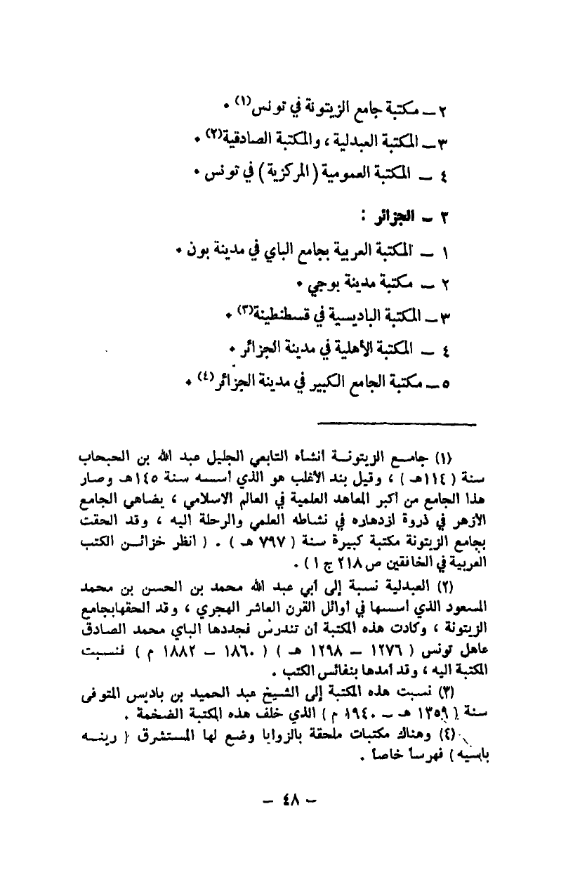 1 جامع الزيتونة أنشأه التابعي الجليل عبد الله بن الحبحاب سنة 114هـ، وقيل بن الأغلب هو الذي أسسه سنة 145هـ، وصار هذا الجامع من اكبر المعاهد العلمية في العالم الإسلامي، يضاهي الجامع الأزهر في ذروة ازدهاره في نشاطه العلمي والرحلة إليه، وقد ألحقت بجامع الزيتونة مكتبة كبيرة سنة 797هـ. انظر خزائن الكتب العربية في الخافقين ص218 ج1.